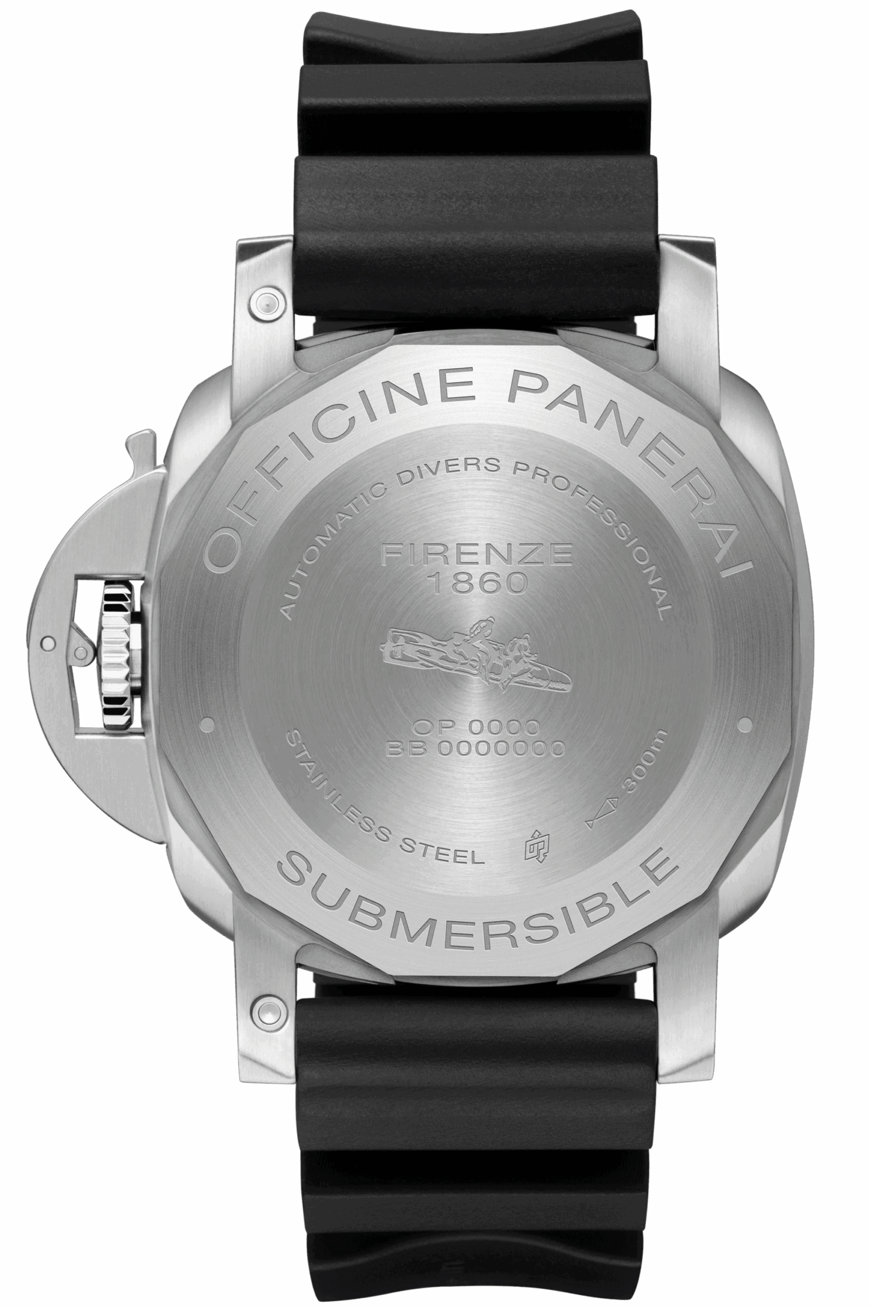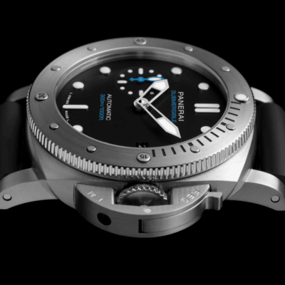Unworn Men’s Watch Panerai Submersible – 42mm, of AISI 316L brushed steel case, Reference PAM00973. The model has Black dial with luminous Index hour markers at 6 and 12 o’clock positions and rest of the hour markers in the form of large dots with luminescent filling. This watch is bold the iconic large silver-tone skeleton sword-shaped different hands of polished steel with bold blue luminescent fill. Date window located 3 o’clock position. Also watch has one-small second subdial at 9 o’clock with luminous blued steel hand, with marked in bold luminous dots and indexes across every 15 minutes. This Officine Panerai signature element speaks innovation and seamless function. The dial closed by a Scratch-resistant Sapphire Crystal. The watch has Panerai’s (protected as a trademark) instantly recognizable crown protector and screws down the crown of polished steel with a ribbed edge for a comfortable grip. They have case shape Cushion and solid case back of brushed steel made. The watch is equipped anti-clockwise rotating bezel of brushed steel with a graduated 15-minute scale. It also has raised points at 5-minute intervals, marked separately for 15, 30 and 45 minutes, and a large luminous point at the origin. The Model comes with Panerai Caliber P.900 automatic movement, containing 23 Jewels and has a power reserve of approximately 72 hours. The watch presented on a black rubber strap secured by a Tang buckle. The water resistance is up to 300m/1000ft.