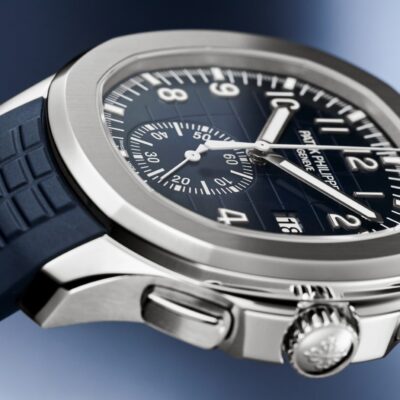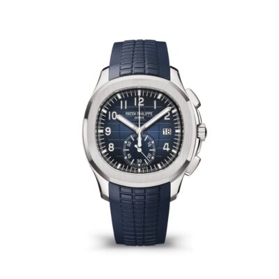 New Patek Philippe Aquanaut Chronograph luxury sports watch, 42,2mm, 18k White Gold, Ref. 5968G-001. The first chronograph with a flyback function in the modern Aquanaut sports collection, which perfectly matches the character of this young and dynamic watch line. His 18k White Gold rounded, pillow-like octagon-shaped case and gently curved ears are unmistakable. The beautiful embossed dial features a radial gradient transition of a slightly lighter blue center and darker blue fading to black at the edges, giving it an even three-dimensional look. Perfectly readable large applied polished Arabic numerals made of 18k White Gold with luminescent coating in the form of hour markers look harmoniously. The manufacturer paid special attention the second track on the outer rim of the dial. She is applied with long and short silvery with lines with fairly wide luminous marks located every 5 minutes. Large polished luminous hour and minute hands in 18 k White Gold indicate the time. These are complemented by a slim and elegant chronograph second hand (Sweep seconds hand). At the 6 o’clock position, there is a recessed black auxiliary chronograph counter with reverse movement repeating which follows the rounded octagonal shape of the bezel. It has glowing white Arabic numerals, white markers, and a white indicator needle. The date window is traditionally at the 3 o’clock position. Rectangular 18 k White Gold buttons located on the right side of the case control the chronograph. At the 8 o’clock, position on the case is an instant date corrector. A polished 18 k White Gold screw-down crown with a ribbed edge for a comfortable grip and the Patek Philippe logo is the finishing touch to the perfect picture. The dial is covered with a scratch-resistant sapphire crystal. The screw-down case back is also made of sapphire crystal, which allows you to see the magical work of the movement. Against this backdrop, a flat, fixed bezel in 18 k White Gold, vertically ground on the front and polished on the sides, provides a wide view of the dial. The finish on the side of the bezel is amazing because at first glance, it looks rounded, but upon closer inspection, you can see the crisp edges playing with the light. The model is equipped with a Patek Philippe caliber CH 28‑520 C with a self-winding mechanical movement containing 32 jewels and a power reserve of min. 45 hours – max. 55 hours. This beautiful sport chic watch is presented on a midnight blue tropical rubber strap. This new composite material is highly resistant to wear, salt water and UV radiation. The strap are fastens with Patek Philippe’s patented 18 k White Gold folding clasp, polished and engraved with the Calatrava cross. Opening the clasp reveals the engraved Patek Philippe logo with the word GENEVE. Water resistant up to 120m/394ft (12 ATM).