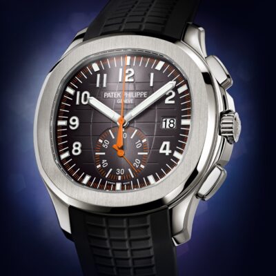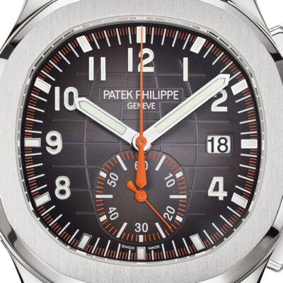 New Patek Philippe Aquanaut Chronograph luxury sports watch, 42,2mm, Stainless Steel, Ref. 5968A-001. The first chronograph with a flyback function in the modern Aquanaut sports collection, which perfectly matches the character of this young and dynamic watch line. His Stainless Steel rounded, pillow-like octagon-shaped case and gently curved ears are unmistakable. A beautiful embossed black dial with a geosphere pattern is complemented by shades of orange (second hand, auxiliary counter hand and second track), which makes the watch more expressive, youthful, and fresh. Perfectly readable large applied polished Arabic numerals made of 18k White Gold with luminescent coating in the form of hour markers look harmoniously. The manufacturer paid special attention to the second track on the outer rim of the dial. She is applied in long silver and small orange lines with fairly wide luminous marks located every 5 minutes. The time is indicated by large polished luminous hour and minute hands in 18k White Gold. These are complemented by a slim and elegant luminous orange chronograph second hand (Sweep seconds hand). She is used also as a continuously running second. At the 6 o’clock position, there is a recessed black auxiliary chronograph counter with reverse movement. It has glowing white Arabic numerals, white markers with orange accents, and an orange indicator needle. The date window is traditionally at the 3 o’clock position. The chronograph is controlled by rectangular Stainless Steel buttons located on the right side of the case. At the 8 o’clock, position on the case is an instant date corrector. A polished Stainless Steel screw-down crown with a ribbed edge for a comfortable grip and the Patek Philippe logo is the finishing touch to the perfect picture. The dial is covered with a scratch-resistant sapphire crystal. The screw-down case back is also made of sapphire crystal, which allows you to see the magical work of the movement. Against this backdrop, a flat, fixed bezel in Stainless Steel, vertically ground on the front and polished on the sides, provides a wide view of the dial. The finish on the side of the bezel is amazing because at first glance, it looks rounded, but upon closer inspection, you can see the crisp edges playing with the light. The model is equipped with a Patek Philippe caliber CH 28‑520 C with a self-winding mechanical movement containing 32 jewels and a power reserve of min. 45 hours – max. 55 hours. This beautiful sport chic watch is presented on a Black tropical rubber strap (originally fitted) and orange (additional strap), a new composite material that is ultra-resistant to wear, salt water and UV radiation. They are fastens with Patek Philippe’s patented Stainless Steel folding clasp, polished and engraved with the Calatrava cross. Opening the clasp reveals the engraved Patek Philippe logo with the word GENEVE. Water resistant up to 120m/394ft (12 ATM).