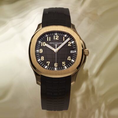 New Patek Philippe Aquanaut Luxury Sports Watch, Date Sweep Seconds, 40,8mm, 18k Rose Gold, Ref. 5167R-001 – reliable and practical, modern and somewhat unexpected, inspired by Nautilus. Their 18k Rose Gold case features a rounded octagon that is unmistakable. A beautiful brown embossed dial looks harmoniously with perfectly readable large applied 18k Rose Gold Arabic numerals with luminescent coating. The time is shown by large stick-shaped hour and minute hands made of 18k Rose Gold with luminescent coating, as well as a thin and elegant second hand (Sweep Seconds). Date indicator in an aperture traditionally located at the 3 o’clock position. A polished 18k Rose Gold screw-down crown with a ribbed edge for a comfortable grip and the Patek Philippe logo create a naturally balanced watch. The dial closed by a Scratch-resistant Sapphire Crystal. Sapphire-crystal too case back, which allows of the case, allows you to see the magical work of the movement. Against this backdrop, the fixed 18k Rose Gold bezel stands out, from satin on the front and polished on the sides, provides a wide view of the dial. The Model has Patek Philippe Caliber 26‑330 S C, with a self-winding mechanical movement containing 30 Jewels, with a power reserve of min. 35 hours – max. 45 hours. This beautiful sport-chic watch presented on a Chocolate brown “tropical” rubber strap, made of a new composite material ultra-resistant to wear, salt water and uv radiation with 18k Rose Gold Aquanaut Fold-over clasp. The water resistance is up to 120m/394ft (12 ATM).