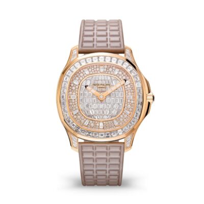 A polished 18k Rose Gold screw-down crown with a ribbed edge for a comfortable grip and the Patek Philippe logo is the finishing touch to the perfect picture. The dial is covered with a scratch-resistant sapphire crystal. A screw-down Sapphire Crystal case back, also made allows you to see the magical workings of the movement. The elegant highlight of this model is the fixed sparkling 18k Rose Gold bezel and lugs set with 48 baguette diamonds (~3.68 ct) flawless. The polishing on the sides impresses with classic precision. It also looks amazing because at first glance, it looks rounded, but on closer inspection, you can see the crisp edges playing with the light. The model is equipped with a Patek Philippe Caliber 324, with a self-winding mechanical movement containing 29 Jewels, with a power reserve of 45 hours. This beautiful sport chic watch is presented on a pearly beige “Tropical” composite strap that continues the visual harmony of the design. The strap are fastens with Patek Philippe’s patented polished 18k Rose Gold folding clasp, and engraved with the Calatrava cross set with 10 baguette diamonds (~0.34 ct). Opening the clasp reveals the engraved Patek Philippe logo with the word GENEVE. Water resistant up to 30m/99ft (3 ATM).