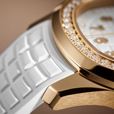New Patek Philippe Aquanaut Luce Travel Time luxury Ladies watch, with a larger diameter 38,8mm, 18k Rose Gold, Ref. 5269/200R-001. The complex quartz wristwatch in the modern Aquanaut sports collection, which perfectly matches this character of young and dynamic watch line. The rounded octagonal 18k Rose Gold body and gently curved lugs, with polished flat surfaces and satin-finish sides are unmistakable. On a magnificent Matte white dial with embossed “Aquanaut” harmoniously looks perfectly readable large applied polished Arabic numerals made of 18k Rose Gold in the form of hour markers. The manufacturer paid special attention to the second track on the outer rim of the dial, on which applied rose gold tones lines with fairly wide luminous marks located every 5 minutes. Large polished luminous hour and minute hands in 18k Rose Gold indicate the time guarantee perfect readability even in the dark. These are complemented by a slim and elegant 18k Rose Gold second hand (Sweep seconds hand). In addition, this model has an additional skeleton hand, which indicates the time of the second time zone. Its setting is quite simple and is done using the crown. Moving forward one click, it sets the local time in increments of one hour forward or backward. Two clicks set the time and stop the movement. At the 6 o’clock, position there is an aperture for indicating the day and night of the home time zone. A polished 18k Rose Gold screw-down crown with inconspicuous and practical adjustment system with a ribbed edge for a comfortable grip and the Patek Philippe logo is the finishing touch to the perfect picture. The dial is covered with a scratch-resistant sapphire crystal. The screw-down Solid case back is made of 18k Rose Gold. The elegant highlight of this model is the fixed sparkling 18k rose gold bezel set with 48 Top Wesselton Pure round diamonds (~1.11 carats) flawless. The polishing on the sides impresses with classic precision. It also looks amazing because at first glance it looks rounded, but on closer inspection you can see the crisp edges playing with the light. The model is equipped with a Patek Philippe caliber E 23‑250 S FUS 24H with a Quartz movement. This beautiful sport chic watch is presented on an Integrated Matt-white strap that continues the visual harmony of the design made of Composite material. He is highly resistant to wear, salt water and UV radiation. The strap are fastens with Patek Philippe’s patented 18k Rose Gold folding clasp, polished and engraved with the Calatrava cross. Opening the clasp reveals the engraved Patek Philippe logo with the word GENEVE. Water resistant up to 60m/200ft (6 ATM).