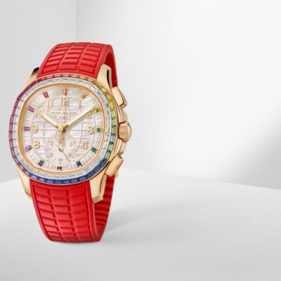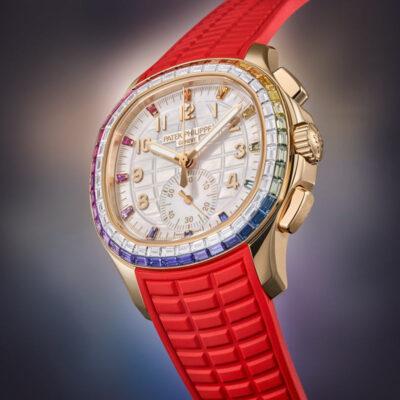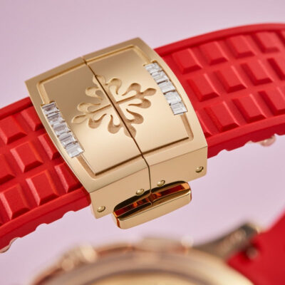 Introducing the Patek Philippe Aquanaut Luce “Rainbow” Chronograph 7968-300R-001, a dazzling embodiment of luxury and vibrant style. This exceptional women’s watch features a 39.9mm rose gold case, beautifully accentuated by a rainbow-colored array of sapphires on the bezel, creating an eye-catching display of elegance and modernity. The dial White mother-of-pearl, engraved with Aquanaut pattern, baguette multicolored sapphire hour markers and gold applied numerals. This model also introduces a new function to the Aquanaut collection: a 30-minute chronograph, enhancing its functionality with a stylish sub-dial at 6 o’clock. Driven by the caliber CH 28-520, an automatic movement renowned for its precision and reliability, this watch offers a power reserve of 45-55 hours. The sapphire crystal case back allows enthusiasts to admire the intricate mechanics of the movement, showcasing Patek Philippe’s commitment to horological excellence. The Composite material, red strap mirrors the dial’s texture and secures comfortably with a fold-over clasp, ensuring the watch remains a constant, comfortable presence on the wrist. Additionally, it boasts water resistance up to 30 meters, making it suitable for varied everyday activities.