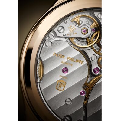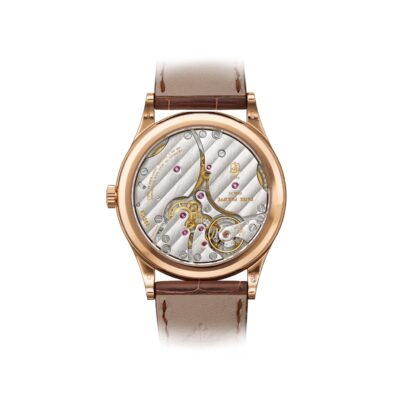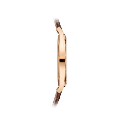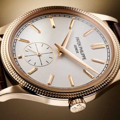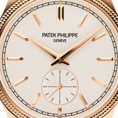 Luxury Patek Philippe Calatrava, 18k Rose Gold, 39mm and Reference 6119R-001. Their distinguishing feature is a Silvery grained dial with a applied 18k Rose Gold faceted hour markers in the shape of boats and hour markers with 18k Rose Gold dots on a black minute scale around the perimeter in a railway style look stylish on it. The dauphin sword-shaped hour and minute hands in 18K Rose Gold, as well as the recessed gray small sub-dial with a permanent second hand with black markers and a gold indicator hand, are spectacular. A polished 18k Rose Gold Screw-down crown with a ribbed edge for easy grip and the Patek Philippe logo is located on the right side of the case. The dial closed by a Scratch-resistant Sapphire Crystal and sapphire-crystal case back which allows of the case, allows you to see the magical work of the movement. The watch features the recognizable polished downward-turning lugs and the bezel fixed in 18K Rose Gold with a guilloche “Clous de Paris” pattern in the form of double-row stepped jagged nails. The watch Patek Philippe Caliber 30‑255 PS mechanical manually wound movement, containing 27 Jewels, and has a power reserve of 65 hours. This model, presented on is on shiny chocolate brown Alligator leather strap with square scales and hand-stitched. It zips up 18k Rose Gold Prong buckle. The water resistance is up to 30m/100ft (3 ATM).