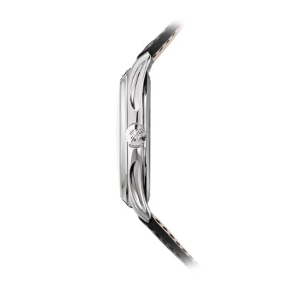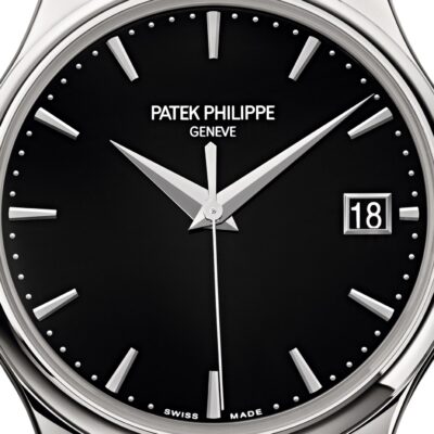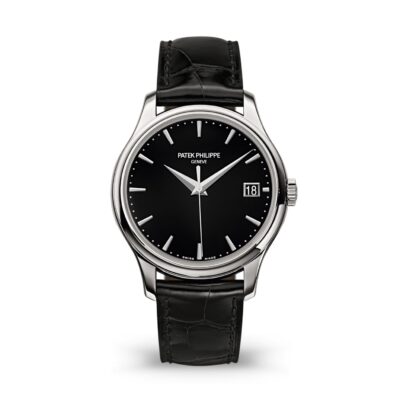 Luxury Patek Philippe Calatrava polished 18k White Gold, 39mm, Reference 5227G-010sleek lines and sophisticated elegance. The minimalistic Black lacquered dial is classic in style and perfect for business attire. On him looks spectacular applied trapeze shaped indexes hour markers, polished 18k White Gold dauphine-style hands and 18k White Gold Dot minute markers around the outer rim. In addition, this model is equipped with a spectacular Center sweep second hand and an aperture-type date at the 3 o’clock position. A polished 18k White Gold Push/pull crown with a ribbed edge for easy grip and the Patek Philippe logo is located on the right side of the case. The dial closed by a Scratch-resistant Sapphire Crystal. Sapphire-crystal too case back, which allows of the case, allows you to see the magical work of the movement with protected by an invisibly hinged dust cover. The watch features an 18k White Gold fixed polished smooth bezel. This model has caliber Patek Philippe Caliber 324 S C, a self-winding mechanical movement containing 29 Jewels, with a power reserve of min. 35 hours – max. 45 hours. She is presented is on shiny dark chestnut Alligator/Crocodile leather strap with square scales, hand-stitched and an 18k White Gold Prong buckle. The water resistance is up to 30m/100ft (3 ATM).