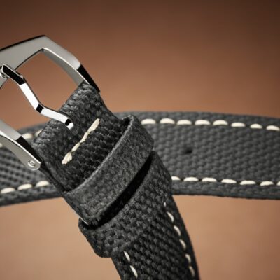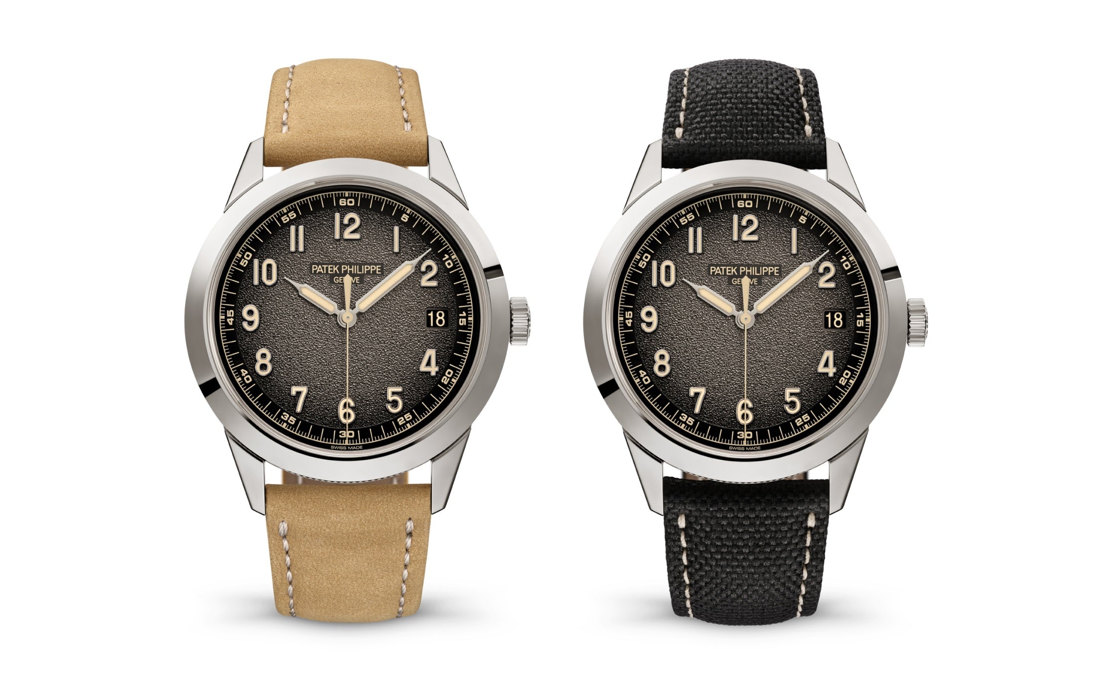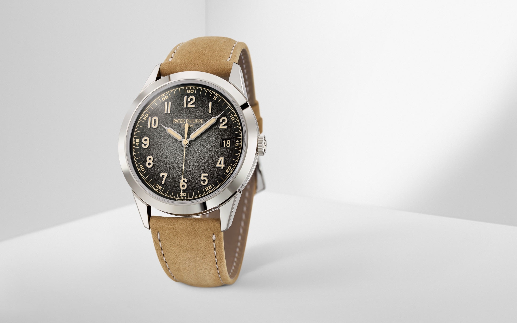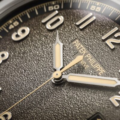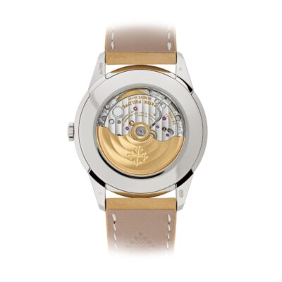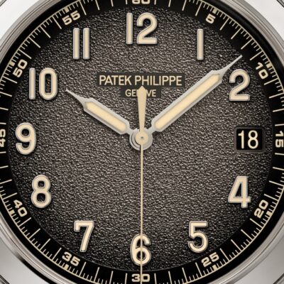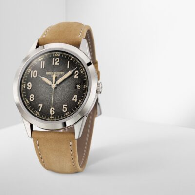 Luxury Patek Philippe Calatrava polished 18k White Gold, 40mm, Reference 5226G-001 wears extremely sporty, and with a slightly military look. The sides of the case are adorning the flanks with a Clous de Paris hobnail pattern typical of the Manufacture and the dial is decorated in a vintage style inspired by old cameras. This model has dial is textured charcoal gray with a black gradient rim. On him looks spectacular overhead Arabic numerals with beige luminescent coating, vintage syringe hands polished 18k White Gold hands and a gradient black minute track with Arabic numerals marking every 5-minute interval that adds instrumental precision to the overall look. In addition, this model is equipped with a spectacular second hand and an aperture-type date at the 3 o’clock position, and stop-seconds mechanism. A polished 18k White Gold crown with a ribbed edge for easy grip and the Patek Philippe logo is located on the right side of the case. The dial closed by a Scratch-resistant Sapphire Crystal and sapphire-crystal case back which allows of the case, allows you to see the magical work of the movement. The watch features an 18K White Gold fixed polished smooth bezel. This model has caliber Patek Philippe Caliber 26‑330 S C, a self-winding mechanical movement containing 30 precious stones, with a power reserve of min. 35 hours – max. 45 hours. This new reference is teamed with two interchangeable straps: one in beige calfskin with a nubuck finish —fitted on the watch— and the other in black calfskin with an embossed fabric motif and beige topstitching that is included with the watch. The straps come with 18k White Gold Prong buckles. The water resistance is up to 30m/100ft (3 ATM).