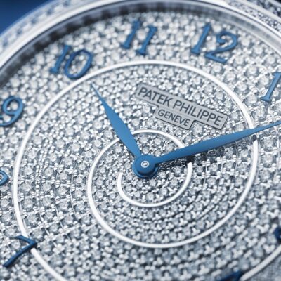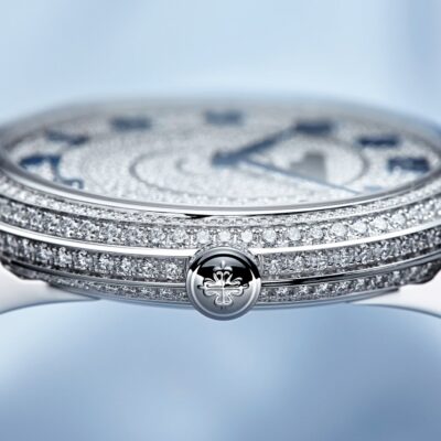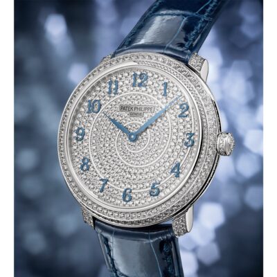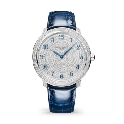 Luxury Ladies Watch Patek Philippe Calatrava Diamond Ribbon Joaillerie, 18kt White Gold, 36,5mm, Reference 4978/400G-001 – Sleek lines and sophisticated elegance combined with meticulous craftsmanship make this timepiece timeless sophistication. The Diamond Ribbon Joaillerie features a very elegant case fully encrusted with diamonds. The beauty of the watch is that Patek Philippe decorates with diamonds even the slanted edge that connects the bezel to the case back. The dial is adorned with a diamond swirl, reminiscent of the spinning ribbons of gymnasts, framed in white gold, which gives the watch a playful touch. To complete the breathtaking design, Patek Philippe opted for blued 18k White Gold leaf-shaped hands, and applied large blued 18k White Gold Arabic numeral hour markers. For the case and dial, 679 graduated diamonds were used, forming a spiral: ~3.99 carats and for the lugs 48 diamonds: ~0.17 ct. A polished 18kt White Gold Screw-down crown with 16 diamonds: ~0.03 ct. and the Patek Philippe logo is located on the right side of the case. The dial closed by a Scratch-resistant Sapphire Crystal. Sapphire-crystal too case back, which allows of the case, allows you to see the magical work of the movement. The watch features fixed bezel from an 18kt White Gold set with diamonds. This model has caliber Patek Philippe Caliber 240, an Ultra-thin self-winding mechanical movement containing 27 Jewels, with a power reserve of 48 hours. She is presented is on shiny dusk blue Alligator/Crocodile leather strap with square scales, hand-stitched and a striking 18kt White Gold prong buckle with 27 diamonds: ~0.21 ct. The water resistance is up to 30m/100ft (3 ATM).