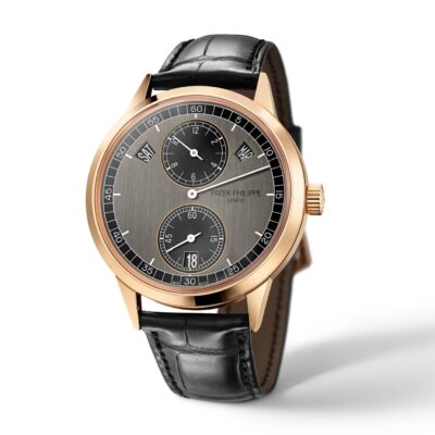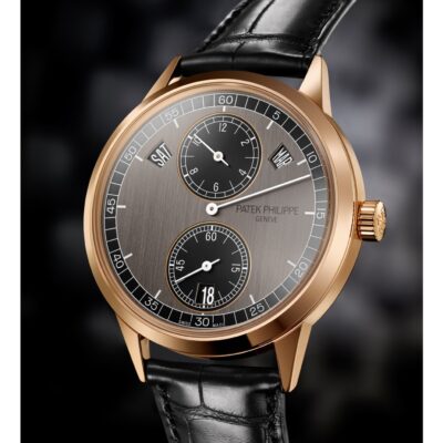 Unworn Luxury Patek Philippe Complication watch. The 18k Rose Gold Annual Calendar Regulator, satin finish case 40,5mm, Reference 5235/50R-001. The model has elegant Two-tone graphite and ebony black, vertical satin finish dial with graceful silver-tone central minute hand and regulator-style display. On the outer edge are White transfer-printed minute markers with Arabic numerals at intervals of every 5 minutes. Hours and seconds are displayed on two additional sub-dials. The patented annual calendar is ingenious mechanism in three apertures, two of which arranged along an arc in the upper half of the dial and Date display at the 6 o’clock position. In the upper half of the dial are Day of the week display at the 10 o’clock position also Month display at the 2 o’clock position. Polished Screw-down 18k Rose Gold crown that with ribbed edge for comfortable grip and logo Patek Philippe are located on the right side of the case. The dial closed by a Scratch-resistant Sapphire Crystal and Scratch-resistant Sapphire Crystal case back. The watch is polished fixed 18k Rose Gold bezel. The watch Patek Philippe Caliber 31‑260 REG QA has Self-winding mechanical movement, containing 31 Jewels, and power reserve min. 38 hours, max. 48 hours. This model presented on matte black alligator leather strap with square scales, hand-stitched secured by an 18k Rose Gold Prong buckle. The water resistance is up to 30m/100ft (3 ATM).