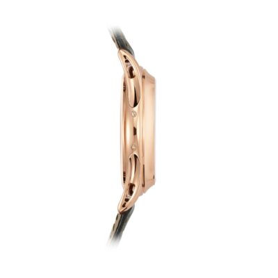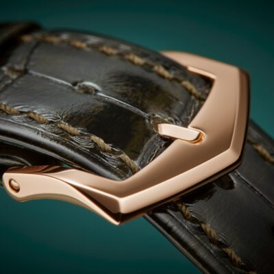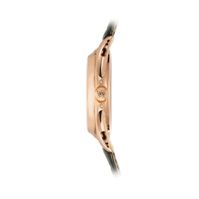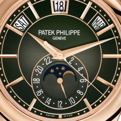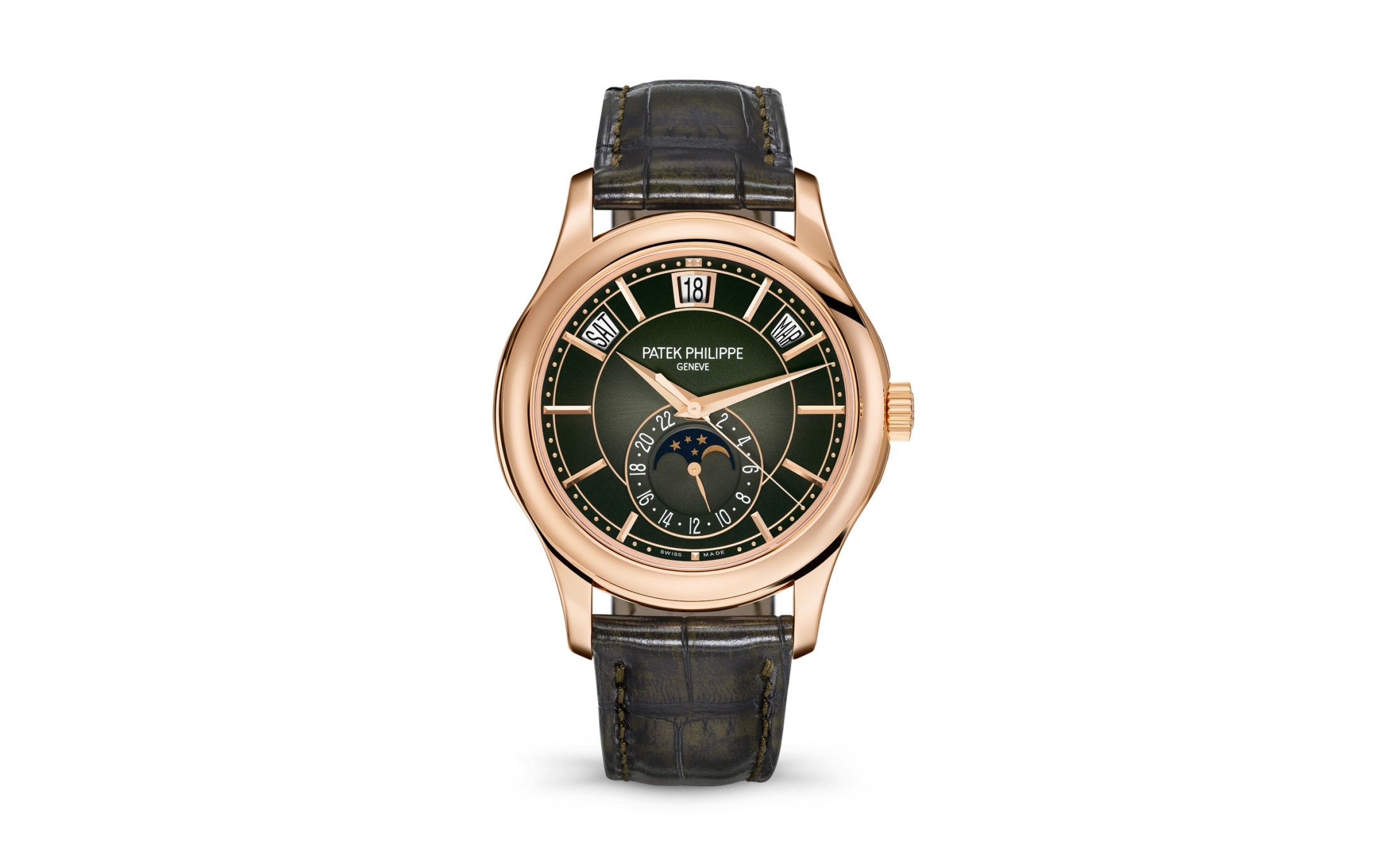 Unworn Luxury Patek Philippe Complication watch. The 18k Rose Gold Annual Calendar / Moonphases, 40mm, Reference 5205R-011. The model has elegant Olive green sunburst dial with black-gradient rim. The 18k Rose Gold faceted applied index hour markers and hands, the Patek Philippe logo at 12 o’clock. On the outer edge of the dial there is a minute scale consisting of 18k Rose Gold dots. The patented annual calendar is ingenious mechanism in three apertures arranged along an arc in the upper half of the dial. In its composition Date display at the 12 o’clock position, Day of the week display at the 10 o’clock position, Month display at the 2 o’clock position. Single combination sub-dial displaying: 24 hours and (inner moonphase) at the 6 o’clock position. Polished Pull/push18k Rose Gold crown that with ribbed edge for comfortable grip and logo Patek Philippe are located on the right side of the case. The dial closed by a Scratch-resistant Sapphire Crystal and Scratch-resistant Sapphire Crystal case back. The watch is fixed slightly concave 18k White Gold bezel. The highlight of this model is the delicately pierced lugs for strap. The watch Patek Philippe Caliber 324 S QA LU 24H/206 has Self-winding mechanical movement, containing 34 Jewels, and power reserve min. 35 hours, max. 45 hours. This model presented on shiny two-tone green hand-patinated alligator leather with square scales, handstitched secured by an 18k Rose Gold Prong buckle. The water resistance is up to 30m/100ft (3 ATM).