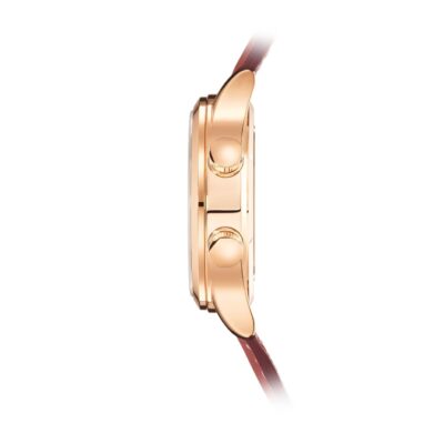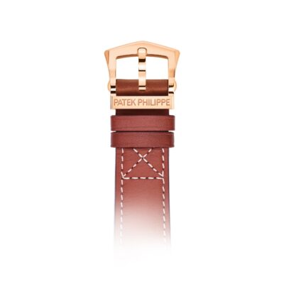 Luxury watch Patek Philippe Complication Calatrava Pilot Travel Time 42mm and Reference 5524R-001. This model was the continuation of a series of historical aviation watches produced by the manufactory in the 1930s. It features an easy-to-read a brown dial and a subtle black gradation toward the periphery. The 18k Rose Gold wand hands with Super-LumiNova and large 18k Rose Gold applied Arabic numerals with Super-LumiNova enhance readability. The skeletonized GMT hand subtly indicates a second time zone: it is positioned behind the main hour hand and is thus hidden when local and home time are the same. There are separate day and night indicators for each time zone (local at 9 o’clock and home at 3 o’clock), as well as an additional date dial at 6 o’clock that displays the date in three-day increments to avoid clutter. In addition, on outer of the dial edge placed there is a around a railroad-style minute scale. Polished screw down winding 18k Rose Gold crown that with ribbed edge for comfortable grip and logo Patek Philippe are located on the right side of the case. In addition, the time zone polished 18k Rose Gold buttons (at 8 o’clock to move the clock forward and at 10 o’clock to return it) are equipped with a patented safety catch to prevent unintentional adjustments and are located on the left side. The dial closed by a Scratch-resistant Sapphire Crystal and Scratch-resistant Sapphire Crystal case back, which allows of the case, allows you to see the magical work of the movement. The watch is equipped slightly inclined fixed polished 18k Rose Gold by a bezel. The watch Patek Philippe Caliber 26‑330 S C FUS has Self-winding mechanical movement, containing 29 Jewels, and power reserve min. 35 hours – max. 45 hours. This watch presented on Vintage brown hand-stitched Calfskin leather strap with 18k Rose Gold Clevis prong buckle. The water resistance is up to 60m/200ft (6 ATM).