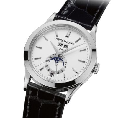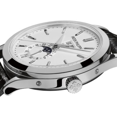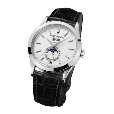 Unworn Luxury Patek Philippe Complication watch. The 18k White Gold Annual Calendar / Moonphases, 38,5mm, Reference 5396G-011. The model has silvery opaline dial the highlight of which are with is beautifully finished with 18k White Gold applied index hour markers and hands and the Patek Philippe logo at 12 o’clock. On the outer edge of the dial there is a minute scale consisting of 18k White Gold dots. The patented annual calendar is ingenious mechanism. Сonsists date in aperture located at 6 o’clock along with the day of the week and the month in apertures at 12 o’clock. Besides there is a 24-hour sub-dial at 6 o’clock and, perhaps the standout feature of this dial, a Moon phase within that. Polished 18k White Gold crown that with ribbed edge for comfortable grip and logo Patek Philippe are located on the right side of the case. The dial closed by a Scratch-resistant Sapphire Crystal and Scratch-resistant Sapphire Crystal case back. The watch is fixed 18k White Gold bezel. The watch Patek Philippe Caliber 324 S QA LU 24H/303 has Self-winding mechanical movement, containing 34 Jewels, and power reserve min. 35 hours, max. 45 hours. This model presented on shiny black alligator strap secured by an 18k White Gold fold-over clasp. The water resistance is up to 30m/100ft (3 ATM).