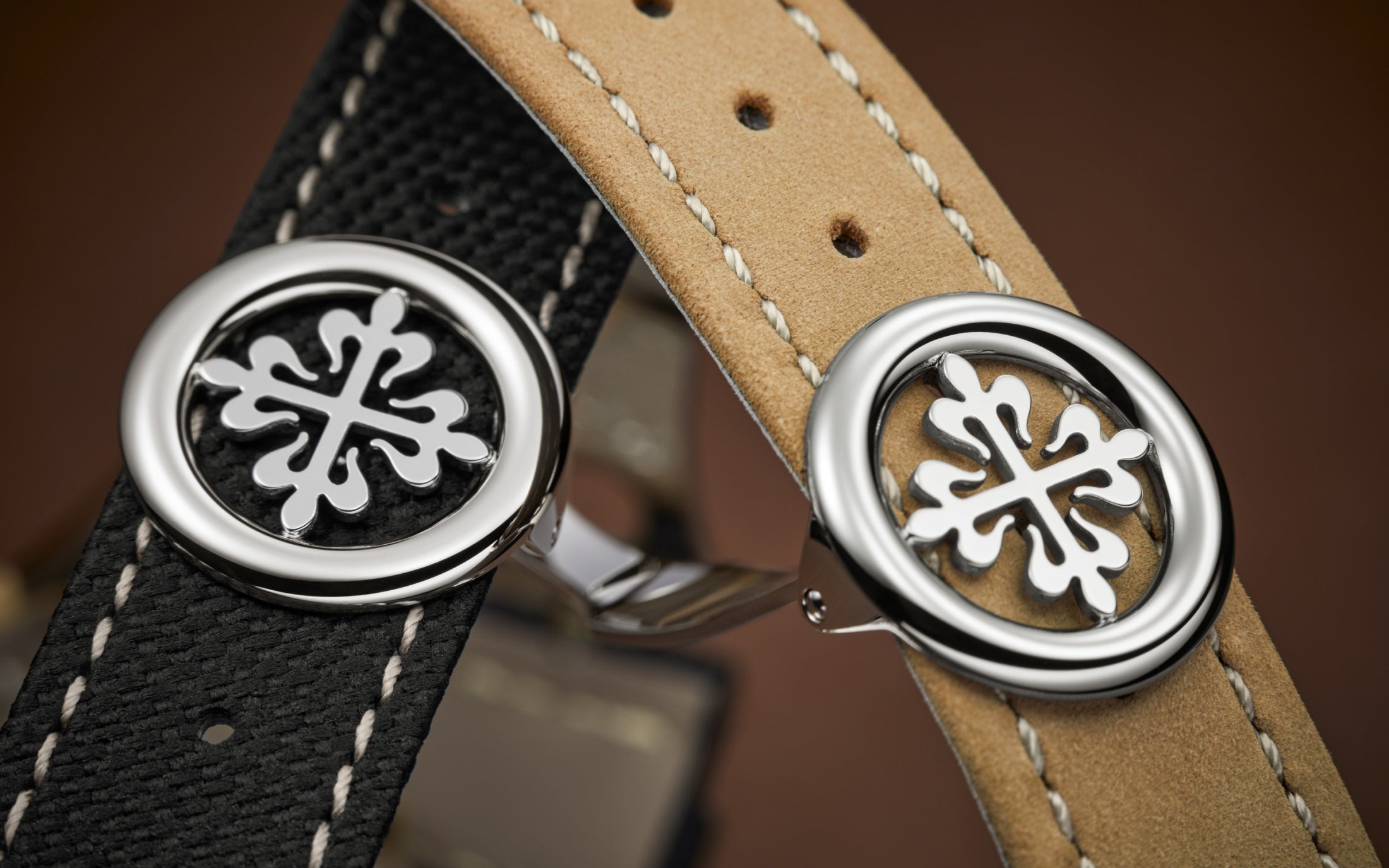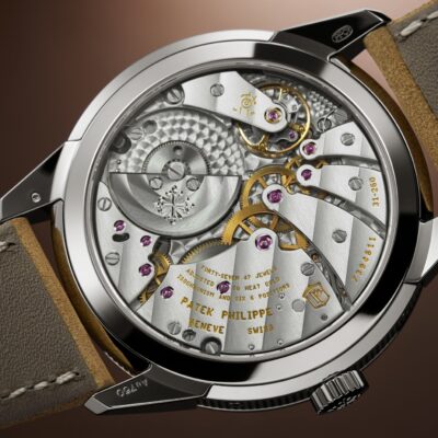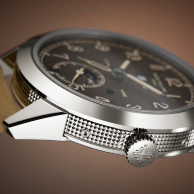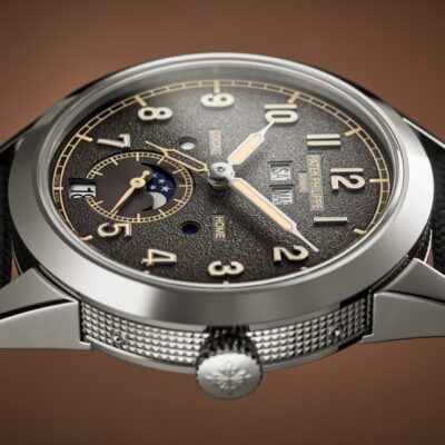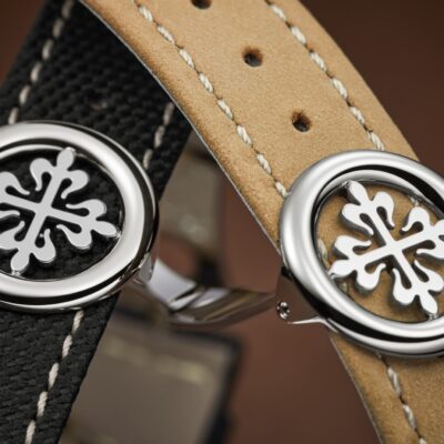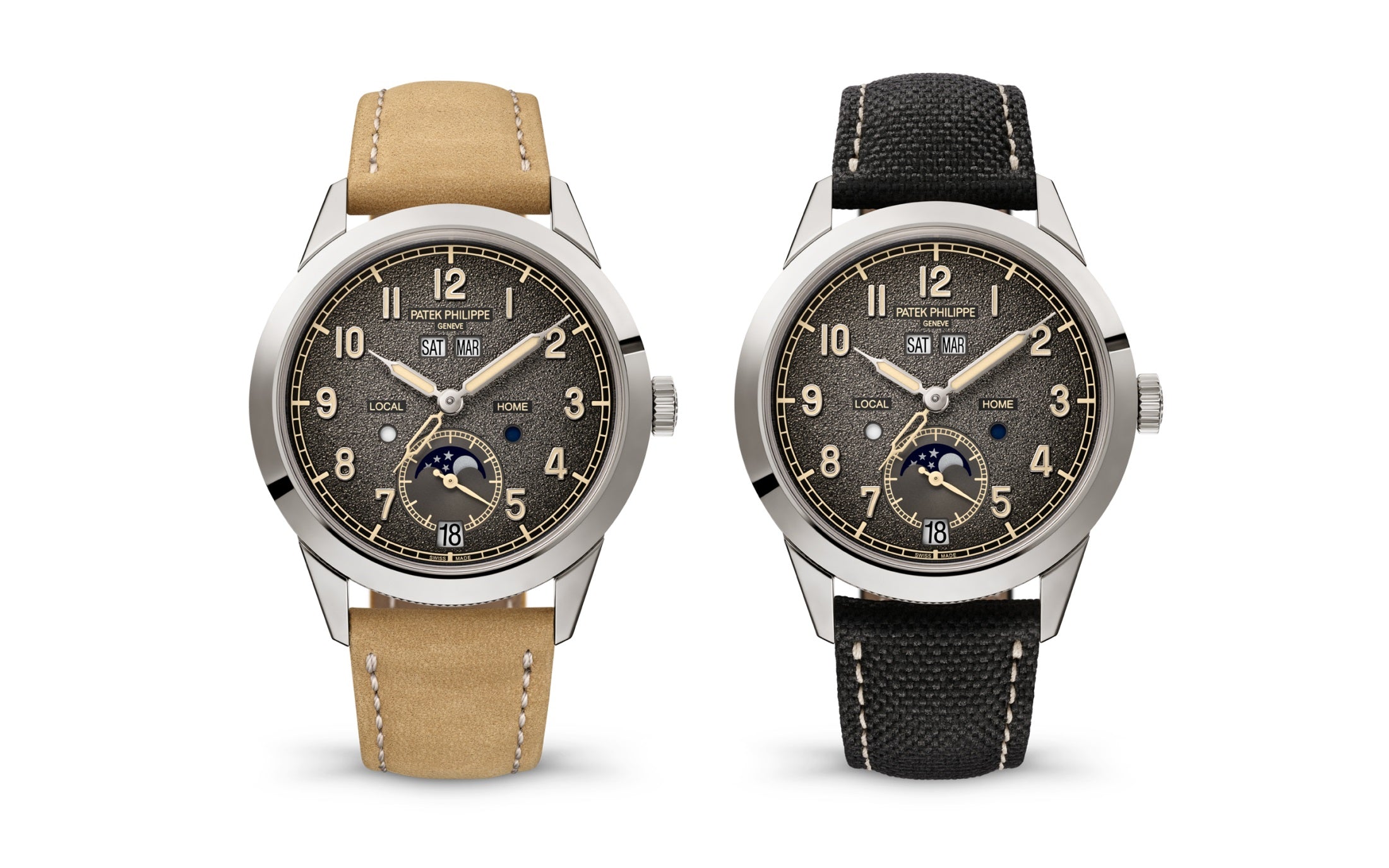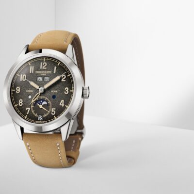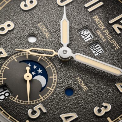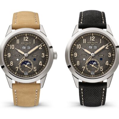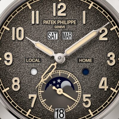 Luxury watch Patek Philippe Complication Annual Calendar Travel Time, Reference 5326G-001. The new 41mm polished 18k White Gold case with beveled bezel is impressive. Its complex architecture, with a central module surrounded by slanted pyramidal lugs attached to the caseback, is unlike anything else in the Calatrava collection. Beautifully composed of horseshoe-shaped nails, consisting of tiny shiny pyramids, the Clous de Paris guilloche pattern adorns the entire circumference of the case. The granular surface of the charcoal grey dial gives the watch its unique personality. The hour numerals used in the watch are made in a retro military style. Applied Arabic numerals in 18k White Gold filled with beige luminescent material. The syringe-shaped hands with pointed tips are also filled with beige luminescent composition, which emphasizes the vintage mood of the watch. The beige color scheme extends to other details on the dial, such as railroad tracks for minutes and small seconds, lettering for the Local and Home night/day indicators, and the brand name at noon. The days of the week and months are displayed in two horizontal rectangular windows at noon, and the date is located at the bottom of the moon phase counter at 6 o’clock; all three indications with a well-read white background and black inscriptions. Three calendar functions can be adjusted using small correctors on the body tape. The third tracery hour hand of a non-lume syringe is used to indicate home time, although not accompanied by a 24-hour track. Instead, two circular holes below the central axis are used to represent day and night in local and home time; white represents day, blue represents night. The Travel Time mechanism indicates the second time zone using the second central hour hand. Polished 18k White Gold crown that with ribbed edge for comfortable grip and logo Patek Philippe. The dial closed by a Scratch-resistant Sapphire Crystal and Scratch-resistant Sapphire Crystal case back, which allows of the case, allows you to see the magical work of the movement. The watch is equipped fixed polished 18k White Gold by a bezel. The watch Patek Philippe Caliber 31‑260 PS QA LU FUS 24H has Self-winding mechanical movement, containing 31 Jewels, and power reserve min. 38 hours – max. 48 hours. Adding to the casual vintage look, Patek Philippe has equipped the with two straps. One (originally fitted) is a beige calfskin strap with a nubuck finish, and the other (additional) is a black strap with beige stitching with an embossed fabric pattern. In yet another move that is in tune with today’s trends, the quick-release spring bars let you exchange the straps in an instant. Straps come with 18k White Gold Fold-over clasps. The water resistance is up to 30m/100ft (3 ATM).