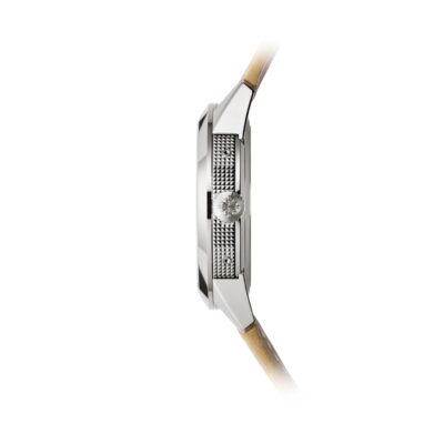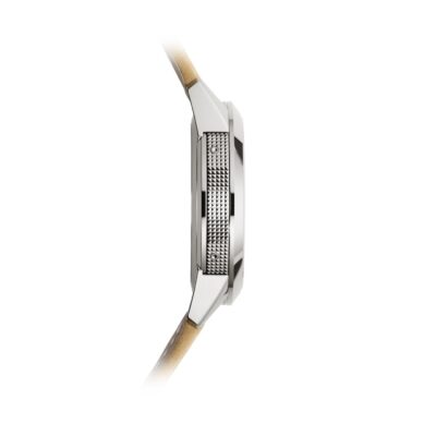 - Bracelet Material: Calfskin, nubuck finish, hand-stitched, beige (originally fitted). Calfskin, embossed with fabric pattern, hand-stitched, black (additional strap)