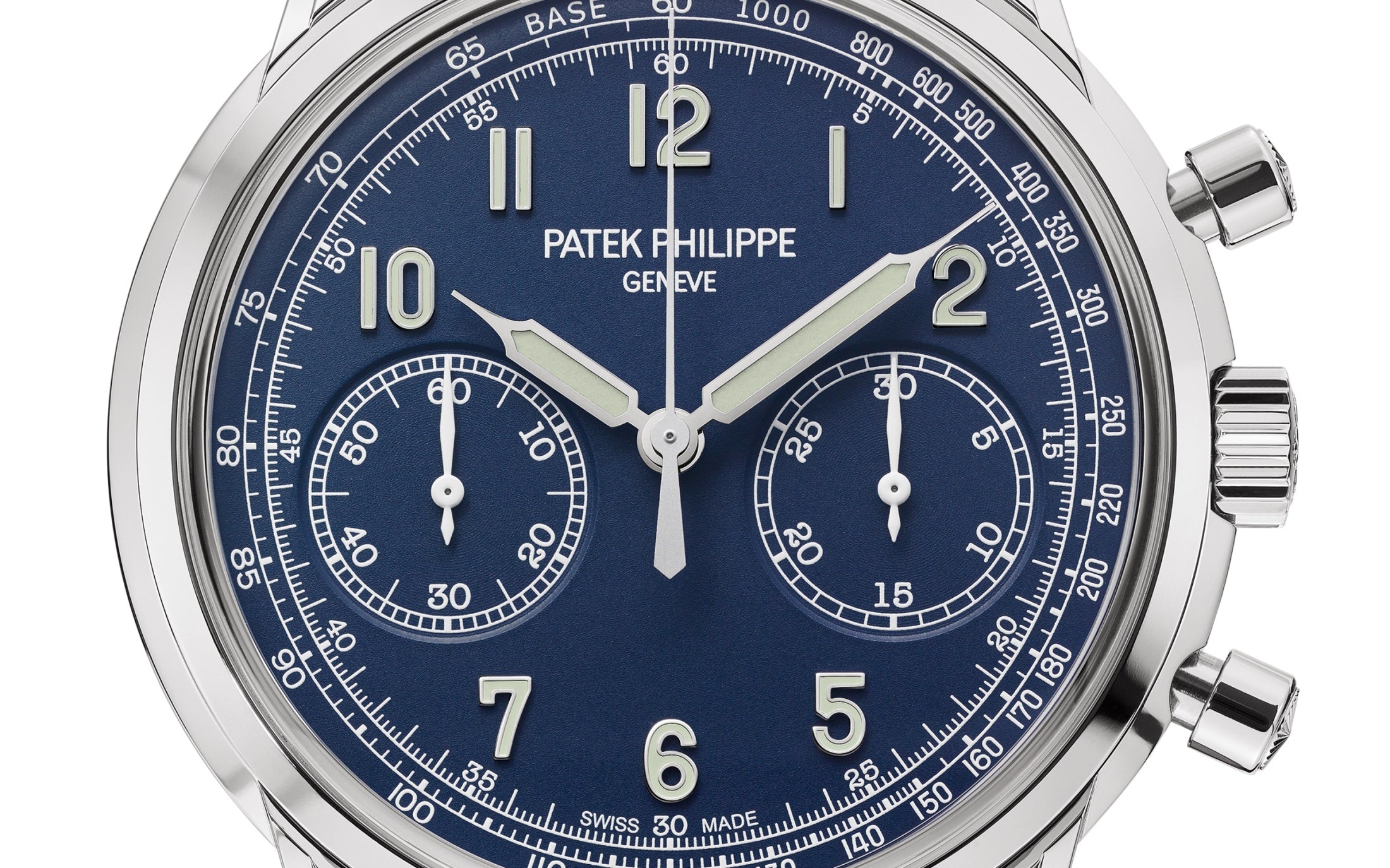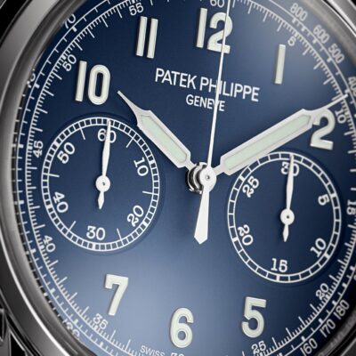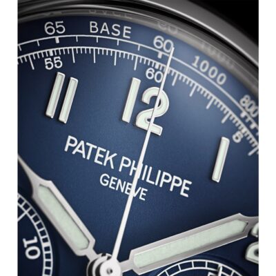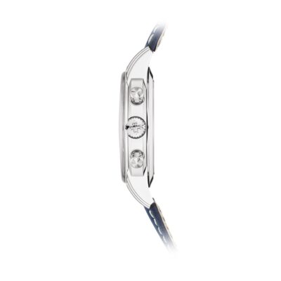 Luxury watch Patek Philippe Complication Chronograph 41mm and Reference 5172G-001. They stand out New 18k White Gold case with round guilloched pushers and three-tier lugs, The dial also sports an all-new look with a striking matte blue varnished coated is graced with 18k White Gold “vintage” luminous fine tipped baton hands. Look harmoniously on the dial applied 18k White Gold Arabic numerals with luminescent coating. On the outer edge are White minute markers as well as Arabic numerals at intervals every 5 minutes and Tachymeter scale. The new round 18k White Gold guilloched pushers allow the central chronograph hand to run on the dial. The chronograph is made up of two sub-dials displaying: 60 second at the 9 o’clock position and 30 minute at the 3 o’clock position. Polished 18k White Gold crown that with ribbed edge for comfortable grip and logo Patek Philippe and polished 18k White Gold chronograph buttons are on the right side of the case. The sapphire «box» crystal emphasizes the sophisticated vintage charm of the watch. The sapphire crystal on the back of the case allows you to see the magical work of the movement. The watch is equipped fixed polished 18k White Gold by a bezel. The watch Patek Philippe Caliber CH 29‑535 PS has manually wound mechanical movement, containing 33 Jewels, and power reserve 65 hours. This watch presented on navy blue Calfskin leather hand-stitched strap with 18k White Gold Fold-over clasp. The water resistance is up to 30m/100ft (3 ATM).