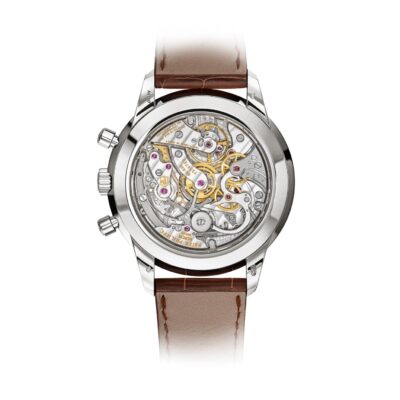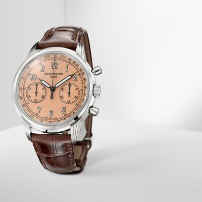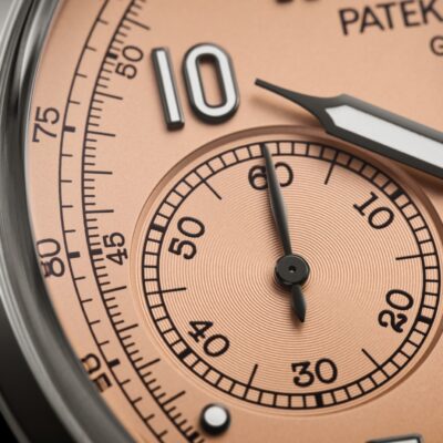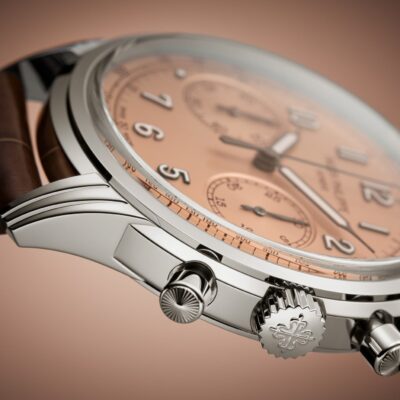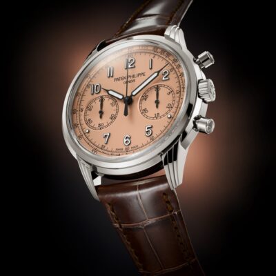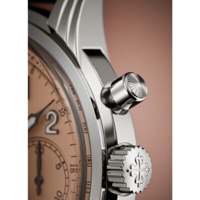 Luxury watch Patek Philippe Complication Chronograph 41mm and Reference 5172G-010. They stand out new 18k White Gold case with round guilloched pushers and three-tier lugs, The biggest change is the dial obviously, now in luscious salmon pink with “vintage” syringe-type white hours/minutes hands made of 18k White Gold with anthracite finish and white luminescent coating. Look harmoniously on the dial applied charcoal gray 18k White Gold Arabic numerals with luminescent coating. On the outer edge are black minute markers as well as Arabic numerals at intervals every 5 minutes and Tachymeter scale. The new round 18k White Gold guilloched pushers allow the central chronograph hand to run on the dial. The chronograph is made up of two sub-dials displaying: 60 second at the 9 o’clock position and 30 minute at the 3 o’clock position. Polished 18k White Gold crown that with ribbed edge for comfortable grip and logo Patek Philippe and polished 18k White Gold chronograph buttons are on the right side of the case. The dial closed by a Scratch-resistant Sapphire Crystal and Scratch-resistant Sapphire Crystal case back, which allows of the case, allows you to see the magical work of the movement. The watch is equipped fixed polished 18k White Gold by a bezel. The watch Patek Philippe Caliber CH 29‑535 PS has manually wound mechanical movement, containing 33 Jewels, and power reserve 65 hours. This watch presented on shiny chocolate brown Alligator leather hand-stitched strap with 18k White Gold Fold-over clasp. The water resistance is up to 30m/100ft (3 ATM).