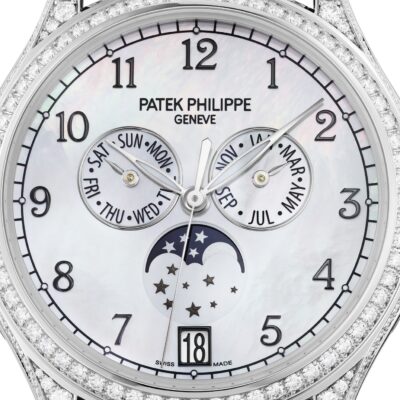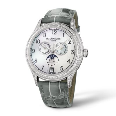 Unworn Luxury Ladies Patek Philippe Complication watch. The 18k White Gold case set with 347 diamonds (~2.65 ct), Annual Calendar, 38mm, Reference 4948G-010. The model has elegant White Balinese mother-of-pearl dial with luminous 18k White Gold leaf-style hands and graceful 18k White Gold Center sweep second hand. The dial decorate large 18k White Gold hour markers in the form Arabic numeral. A minute scale is applied along its outer edge. The patented annual calendar is ingenious mechanism which displaying three multi-function sub-dials: month display at the 3 o’clock position; day of the week display at the 9 o’clock position; moonphase display at the 6 o’clock position. In addition, below it at the 6 o’clock position, there is a date display in the aperture. Screw-down 18k White Gold crown, that logo Patek Philippe decorated set with 14 diamonds (~0.06 ct). The dial closed by a Scratch-resistant Sapphire Crystal and Scratch-resistant Sapphire Crystal case back. The watch is polished fixed 18k White Gold bezel set with 64 diamonds. The watch Patek Philippe Caliber 324 S QA LU has Self-winding mechanical movement, containing 34 Jewels, and power reserve min. 35 hours, max. 45 hours. This model presented on pale gray alligator leather strap with square scales, hand-stitched secured by an 18k White Gold set with 27 diamonds (~0.21 ct) Prong buckle. The water resistance is up to 30m/100ft (3 ATM).