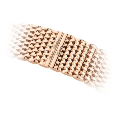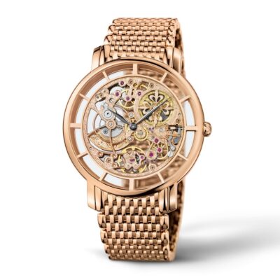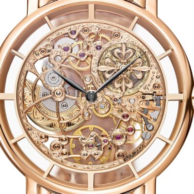 Stunning Patek Philippe Calatrava Skeleton movement with hand-engraved decoration, 18k Rose Gold, 39mm and Reference 5180/1R-001. The fantastic skeleton dial with a beautiful hand engraving, which covers all the details of the mechanism. The « Patek Philippe Genève » signature is engraved around the Calatrava Cross through which the mainspring barrel is visible. The hand engraving is of the highest quality. Her depth is combined with consistent complexity: it is a kind of handiwork that makes things uniquely beautiful. The silver hour and minute hands in the form of leaves look impressive. An unusual solution for hour markers: in addition to their direct function, they are the link between the dial and the bezel. A polished 18k Rose Gold screw-down crown with a ribbed edge for easy grip and the Patek Philippe logo is located on the right side of the case. The dial closed by a Scratch-resistant Sapphire Crystal and sapphire-crystal case back which allows of the case, allows you to see the magical work of the movement. The watch is equipped fixed polished 18k Rose Gold bezel. The watch Patek Philippe Caliber 240 HU Self-winding mechanical movement, containing 33 Jewels, and has a power reserve of min. 48 hours. This model, presented on is very flexible and comfortable to wear an 18K Rose Gold bracelet with 15 links. It zips up 18k Rose Gold Fold-over clasp. The water resistance is up to 30m/100ft (3 ATM).