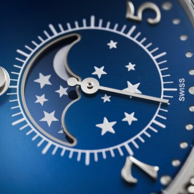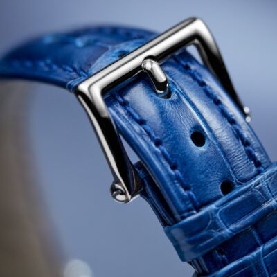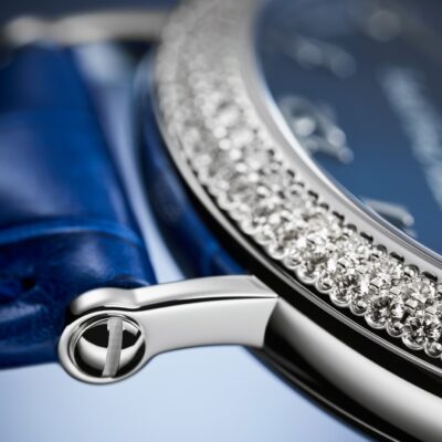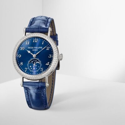 Luxury Ladies’ watch Patek Philippe Complication Moon Phases 18k White Gold, 33mm, Reference 7121/200G-001. The model has elegant Blue dial is enhanced by a sunburst decoration creating subtle light effects, and 18k White Gold intricate shape Poire hands. The dial decorate large applied Breguet 18k White Gold hour markers in the form Arabic numeral. On the outer edge of the dial there is a minute scale consisting of 18k White Gold dots. At the 6 o’clock position there is one sub-dial that stands out like stars in the night sky with a small second hand. Inside it, an indicator of the phases of the moon is organically inscribed inside. Screw-down Stainless Steel crown, that logo Patek Philippe. The dial closed by a Scratch-resistant Sapphire Crystal and Scratch-resistant Sapphire Crystal case back. A special highlight of this model is the 18K White Gold bezel with a double row of 132 (~1.09 cts.) brilliant-cut diamonds based on the exclusive lacy Dentelle gem setting technique. The watch Patek Philippe Caliber 215 PS LU has manually wound mechanical movement, containing 18 Jewels, and power reserve min. 39 hours, max. 44 hours. This watch presented on shiny blue Alligator leather with square scales, hand-stitched, and an 18k White Gold Prong buckle. The water resistance is up to 30m/100ft (3 ATM).