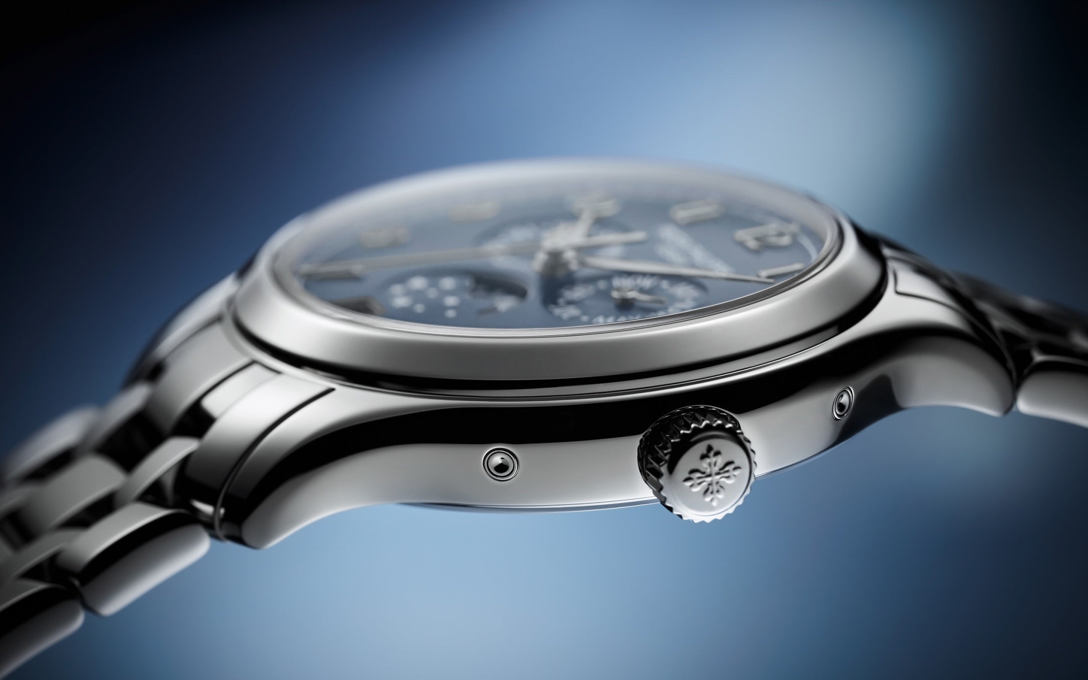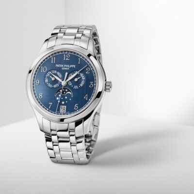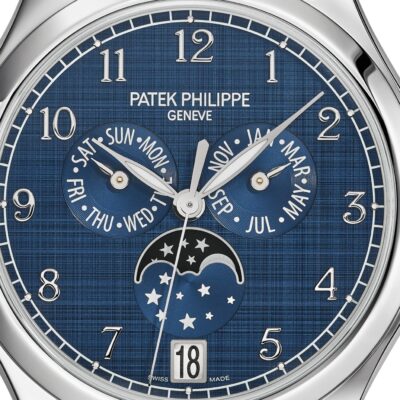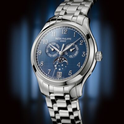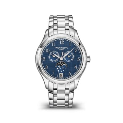 Unworn Luxury Patek Philippe Complication Stainless Steel Annual Calendar, 38mm watch, Reference 4947/1A-001. The model has elegant Blue dial with vertical horizontal satin-finish (“shantung” finish), and luminous 18k White Gold leaf-style hands and graceful 18k White Gold Center sweep second hand. The dial decorate large 18k White Gold hour markers in the form Arabic numeral. A minute scale is applied along its outer edge. The patented annual calendar is ingenious mechanism which displaying three multi-function sub-dials: month display at the 3 o’clock position; day of the week display at the 9 o’clock position; moonphase display at the 6 o’clock position. In addition, below it at the 6 o’clock position, there is a date display in the aperture. All the functions are controlled by the recessed pushers within the caseflanks. Screw-down Stainless Steel crown, that logo Patek Philippe. The dial closed by a Scratch-resistant Sapphire Crystal and Scratch-resistant Sapphire Crystal case back. The watch is polished fixed Stainless Steel bezel. The watch Patek Philippe Caliber 324 S QA LU has Self-winding mechanical movement, containing 34 Jewels, and power reserve min. 35 hours, max. 45 hours. This watch is equipped with a new integrated and entirely polished bracelet featuring five rows of links secured by a Stainless Steel double-Fold-over clasp. The water resistance is up to 30m/100ft (3 ATM).