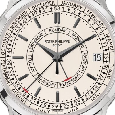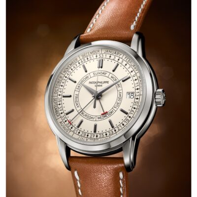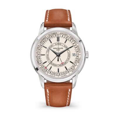 Unworn Luxury Patek Philippe Complication watch, Reference 5212A-001. The Stainless Steel Calatrava Weekly Calendar, 40mm with optimized performance. The model has Silvery Opaline dial the highlight of which are with is notable for its exclusive letters and numerals, which authentically reproduce handwritten characters. Month markers are located along the outer edge of the dial. Closer to the center are week markers. Next come the index hour markers with a dotted minute track. Applied hour markers are made of blackened 18K White Gold. In the center is an additional dial with the days of the week. Classic Hour and minute hands made blackened 18k White Gold. Two other thin hands blackened 18k White Gold with flat red finish indicates the day, week number and month. Polished Stainless Steel Screw-down crown that with ribbed edge for comfortable grip and logo Patek Philippe are located on the right side of the case. The dial closed by a Scratch-resistant Sapphire Crystal and Scratch-resistant Sapphire Crystal case back. The watch is fixed Stainless Steel bezel. The watch Patek Philippe Caliber 26‑330 S C J SE has Self-winding mechanical movement, containing 50 Jewels, and power reserve min. 35 hours, max. 45 hours. This model presented on light brown Calfskin, hand-stitched with Stainless Steel Prong buckle. The water resistance is up to 30m/100ft (3 ATM).