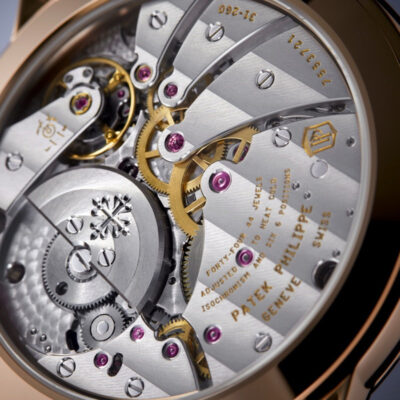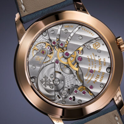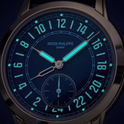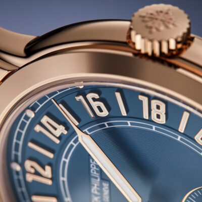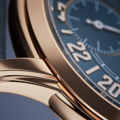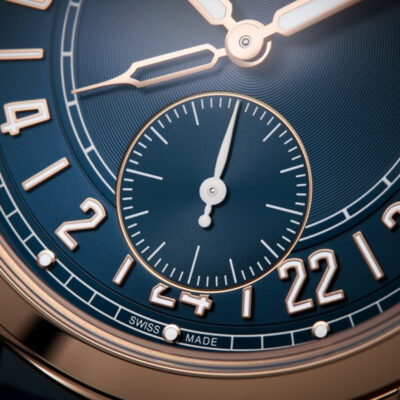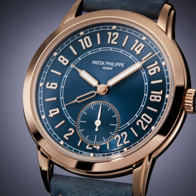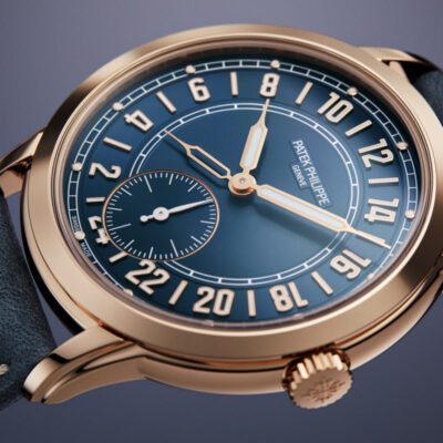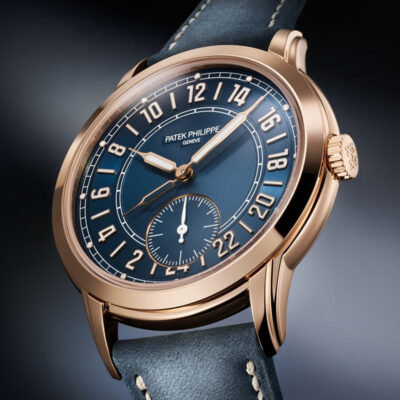 Introducing the Patek Philippe Calatrava Pilot Travel Time 5224R-001, an exquisite timepiece that combines vintage charm with modern sophistication. Crafted from 18k rose gold, this 42mm watch exudes elegance, designed for those who appreciate both classic aesthetics and contemporary functionality. The Blue dial is striking, adorned with gold applied numerals that provide a brilliant contrast. The distinctive syringe-style hands are coated with luminescent material, ensuring readability in any lighting condition. This watch features a dual time zone mechanism, ideal for travelers. Local and home time indicators, positioned at 9 and 3 o’clock, display day and night for clarity, while a date sub-dial at 6 o’clock integrates seamlessly into the layout. The 5224R-001 is powered by the self-winding Caliber 31-260 PS FUS 24H, known for its precision and reliability. The sapphire crystal case back reveals the meticulous craftsmanship of the movement, a hallmark of Patek Philippe’s dedication to horological excellence. A vintage brown calfskin strap complements the rose gold case, featuring a clevis prong buckle that echoes the aviator aesthetic. The watch is water-resistant up to 30 meters, ensuring durability alongside luxury.