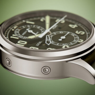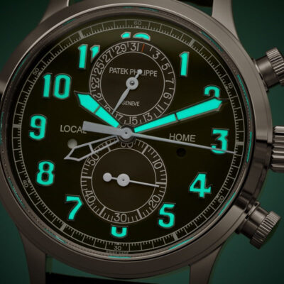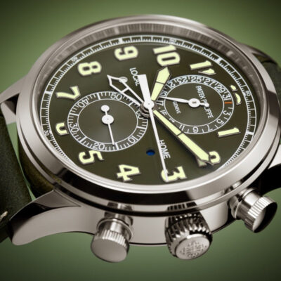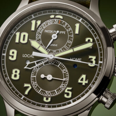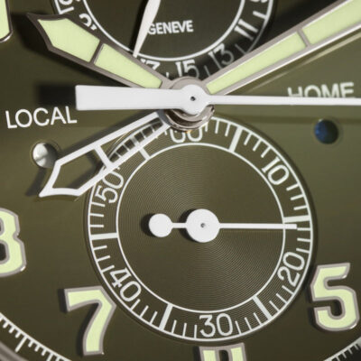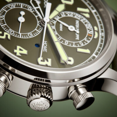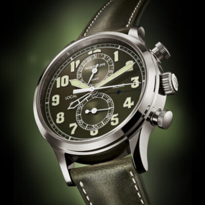 Discover the Patek Philippe Complications 5924G-010, a splendid manifestation of luxury and precise engineering. Crafted in exquisite 18k white gold, this 42mm timepiece embodies the prestige of Patek Philippe’s craftsmanship, perfect for the discerning watch aficionado. The watch features a striking Lacquered khaki greent dial that captures attention with its vibrant hue. It is adorned with white gold applied numerals and broad baton hands with a luminescent coating, ensuring outstanding readability under all conditions. This model stands out with its practical flyback chronograph function and a dual time zone feature, ideal for global travelers. The two pushers on the left side of the case allow for easy adjustments of the local time, with clear day/night indicators for both home and local times, enhancing its functionality. Powered by the robust Caliber CH 28-520 C FUS, this self-winding mechanical movement showcases Patek Philippe’s commitment to excellence. The movement can be admired through the sapphire-crystal case back, revealing intricate details and the beauty of its construction. With a power reserve of 45-55 hours, this watch is as reliable as it is elegant. The watch is complemented by a hand-stitched navy blue alligator strap with a fold-over clasp, ensuring a secure and stylish fit. Water-resistant up to 30 meters, it is designed to handle everyday wear with sophistication and grace.