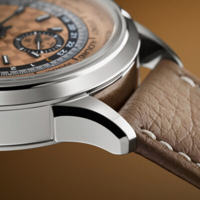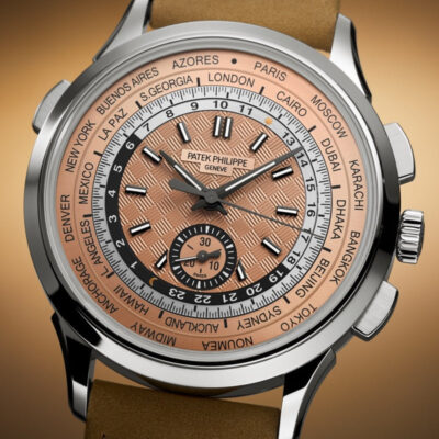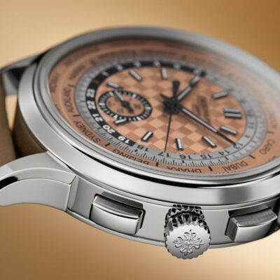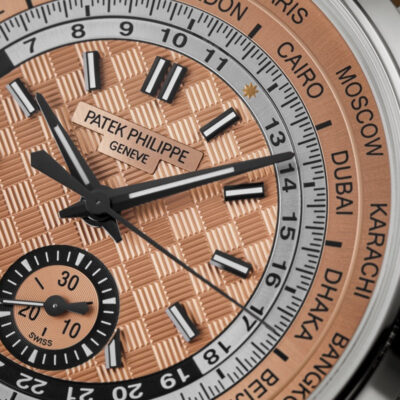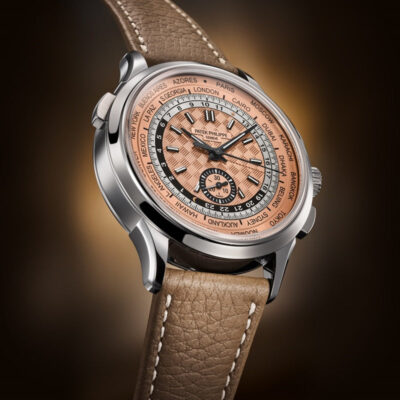Introducing the Patek Philippe Complications 5935A-001, an exceptional timepiece that marries traditional craftsmanship with advanced functionality. Crafted in stainless steel, this 41mm watch is designed for those who appreciate intricate detailing and sophisticated design. The Rose-gilt opaline with “carbon” motif dial commands attention, complemented by white gold applied numerals and luminescent hands that ensure visibility in all conditions. This model is notable for its world time function, featuring a 24-hour and day/night indication for all 24 time zones, making it ideal for world travelers and business professionals alike. Equipped with the self-winding Caliber CH 28‑520 HU, the 5935A-001 showcases Patek Philippe’s excellence in watchmaking. This movement is visible through the sapphire-crystal case back, highlighting the meticulous craftsmanship and attention to detail inherent in every component. The power reserve of 48 hours ensures reliability for extended use. The watch is elegantly finished with a hand-stitched beige calfskin strap and a stainless steel fold-over clasp, which provides a comfortable fit and a secure closure. Water-resistant up to 30 meters, this timepiece is perfectly suited for daily wear, capable of handling splashes or brief immersion in water.