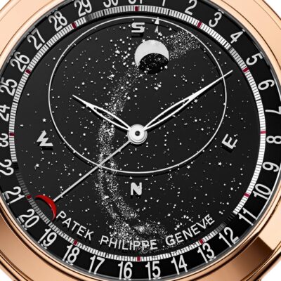 Unworn Luxury Patek Philippe Grand Complication Astronomical watch, 44mm, 18k Rose Gold, Reference 6102R-001. The dial is a distinctive and unique feature of this model. It consists of Black sapphire-crystal disks for sky background and moon phases. As well as transparent sapphire-crystal disk for sky chart and Milky Way. Look stylish silver-tone Hands skeleton leaf-style shape. An unusual solution to this model are hour markers in the form of red dots and a minute scale with an interval of three minutes. The date mechanism also looks original. All the dates of the month are arranged along the contour of the dial, and a separate red-tipped hand indicates the current date. Polished 18k Rose Gold correction push-pieces that with ribbed edge for comfortable grip and logo Patek Philippe are located on the right side of the case. The dial closed by a Scratch-resistant Sapphire Crystal and exhibition case back. The watch is equipped fixed polished 18k Rose Gold bezel. The watch Patek Philippe Calibre 240 LU CL C Automatic movement, containing 45 Jewels, composed of 315 parts, bitting at 21600 vph, and has a power reserve of approximately 48 hours. This model presented on Shiny black Alligator strap with square scales, hand-stitched, and 18k Rose Gold fold-over clasp. The water resistance is up to 30m/100ft (3 ATM).
