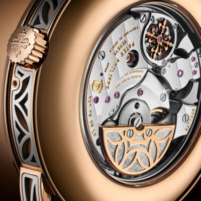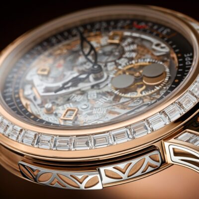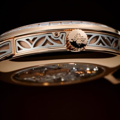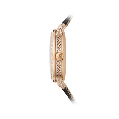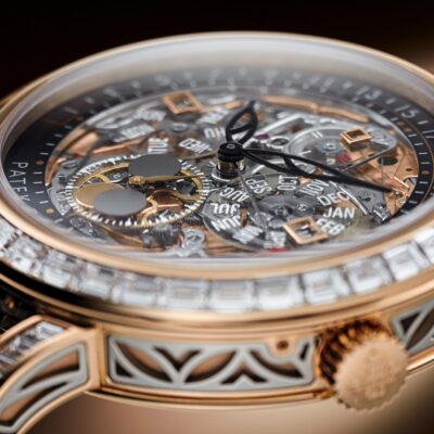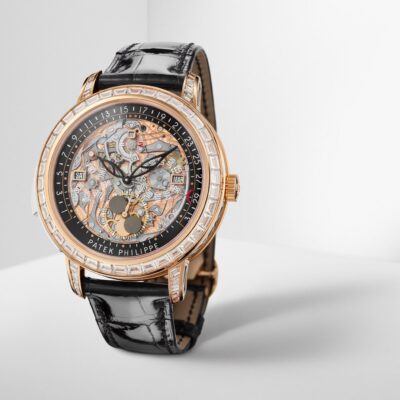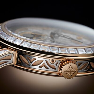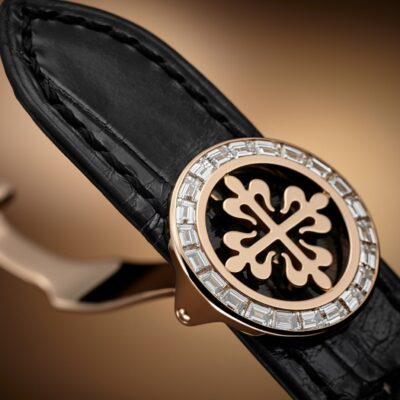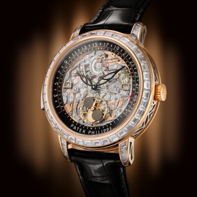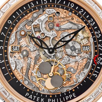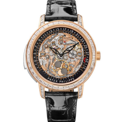 Unworn Luxury Patek Philippe Grand Complication watch, 43mm, 18k Rose Gold set with baguette diamonds, Reference 5304/301R-001. The 18k White Gold inlays with leaf motif engraved on the sides of the case, lugs and minute repeater add an element of sophistication and intricacy. The Transparent sapphire-crystal dial is a distinctive feature of this model. An ingenious solution is a system of transparent sapphire discs that appear to “float” on the dial to display the cycle of the day (at the 9 o’clock position), the month (at the 3 o’clock position), and the leap year (at the 12 o’clock position). The retrograde display of the date, is indicated by an incredibly narrow hand, appendaged with a red crescent, which runs between the 7 and 5 o’clock positions, going along an outer track which contains the date. Using a specific spiral spring, the retrograde hand returns to position 1 instantly after reaching 28, 29, 30 or 31 (depending on the month and the leap year cycle). The perpetual calendar complication is completed by the small seconds at 6 o’clock, accompanied by the Moon phases, which sits underneath the former. The openworked hour and minute hands, also adorned with a leaf motif (but this time in black lacquered white gold) are deliberately conceived in order to be discreet, whilst also maximising the view into the complex engineering of the movement. Polished 18k Rose Gold crown that with ribbed edge for comfortable grip and logo Patek Philippe. The dial closed by a Scratch-resistant Sapphire Crystal and Scratch-resistant Sapphire Crystal case back. The watch is equipped fixed polished 18k Rose Gold bezel. The bezel and lugs decorated 58 baguette diamonds: ~5.25 cts. The watch Patek Philippe Calibre R 27 PS QR LU has Self-winding mechanical movement, containing 41 Jewels, and power reserve min. 38 hours, max. 48 hours. This model presented on Shiny black Alligator strap with square scales, hand-stitched, and 18k Rose Gold set with 22 baguette diamonds fold-over clasp. The water resistance is Humidity- and dust-protected only (not water-resistant).