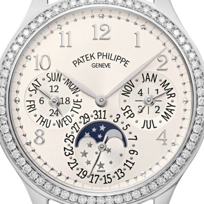 Unworn Patek Philippe Grand Complication Luxury Ladies watch, 35,1mm with 18k White Gold case, Reference 7140G-001. This model has Silvery sunburst dial with polished 18k White Gold hands and large applied polished 18k White Gold Arabic numerals hour markers. Applied polished 18k White Gold dot minute track on teh dial perimeter. Day of the week sub-dial at 9 o’clock. Month sub-dial at 3 o’clock. Date sub-dial at 6 o’clock. 24-hour AM/PM indicator at the center of the 9 o’clock sub-dial. Leap Year indicator located at the center of the 3 o’clock sub-dial. Moonphase indicator located at the center of the 6 o’clock sub-dial. Polished 18k White Gold Pull / push crown with ribbed edge for comfortable grip and logo Patek Philippe. The dial closed by a Scratch-resistant Sapphire Crystal and Interchangeable full case back of sapphire-crystal. The watch is equipped fixed polished 18k White Gold bezel set with 68 brilliant cut diamonds weighing a total of +/- 0.68 carats. The watch Patek Philippe caliber 240 Q, features a solid 22kt micro-rotor, beats at 21,600 vph (3Hz), contains 27 jewels, composed of 275 parts and has a power reserve of 38-48 hours. This model presented on Alligator straps with square scales, hand-stitched, shiny gray (originally fitted) or shiny turquoise green (additional strap). 18k White Gold Prong buckle set with 27 diamonds (~0.2 ct). The water resistance is up to 30m/100ft (3 ATM).