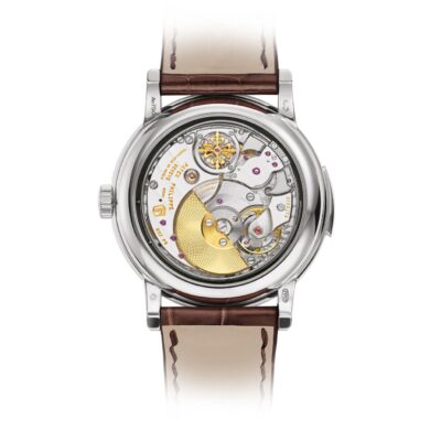 Unworn Luxury Patek Philippe Grand Complication watch, 38mm, with classic gongs, 18k White Gold case, Reference 5078G-001. This model has Cream enamel dial. It features 18k White Gold Breguet hands leaf-shaped, large applied polished Breguet 18k White Gold Arabic numerals hour markers and small seconds at 6 o’clock. Minute markers around the outer rim. 18k White Gold crown with ribbed edge for comfortable grip and logo Patek Philippe. The dial closed by a Scratch-resistant Sapphire Crystal and sapphire-crystal case back (also accompanied by interchangeable). The watch is equipped fixed polished 18k White Gold bezel. The watch Patek Philippe Calibre R 27 PS Self-winding mechanical movement, containing 39 Jewels, and has a power reserve of min. 43 hours – max. 48 hours. This model presented on shiny chocolate brown Alligator strap with square scales, hand-stitched and 18k White Gold fold-over clasp. Humidity and dust protected only (not water-resistant).
