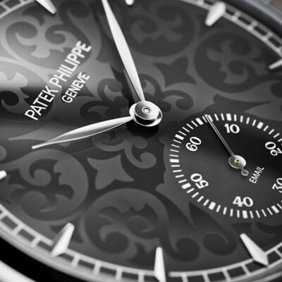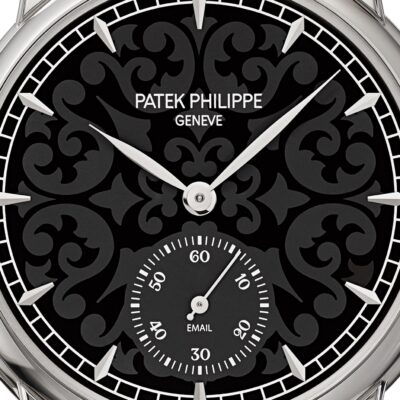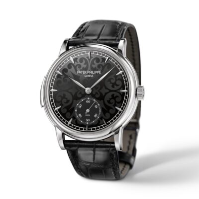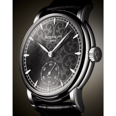 Unworn Luxury Patek Philippe Grand Complication watch, 38mm, with classic gongs, 18k White Gold case, Reference 5078G-010. This model has Black enamel with matte and shiny finishes dial. It features 18k White Gold Breguet hands leaf-shaped, large applied polished Breguet 18k White Gold Arabic numerals hour markers and small seconds at 6 o’clock. Minute markers around the outer rim. 18k White Gold crown with ribbed edge for comfortable grip and logo Patek Philippe. The dial closed by a Scratch-resistant Sapphire Crystal and sapphire-crystal case back (also accompanied by interchangeable). The watch is equipped fixed polished 18k White Gold bezel. The watch Patek Philippe Calibre R 27 PS Self-winding mechanical movement, containing 39 Jewels, and has a power reserve of min. 43 hours – max. 48 hours. This model presented on shiny chocolate brown Alligator strap with square scales, hand-stitched and 18k White Gold fold-over clasp. Humidity and dust protected only (not water-resistant).