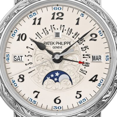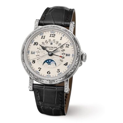 Unworn Patek Philippe Grand Complication Luxury watch, 38mm with 18k White Gold case, Reference 5160/500G-001. This model has Silvery Opaline dial with hand-engraved center black spade-shaped hands and large applied polished Breguet 18k White Gold Arabic numerals hour markers. The distinguishing feature of this watch is new perpetual calendar with a retrograde date hand with red tip moon phase sub-dial located in center main dial. Minute markers around the outer rim with Arabic numerals marking every 5-minute interval. Day of the week sub-dial at 9 o’clock. Month sub-dial at 3 o’clock. 18k White Gold Screw down crown with ribbed edge for comfortable grip and floral pattern. The dial closed by a Scratch-resistant Sapphire Crystal and sapphire-crystal case back protected by a 18k White Gold hand-engraved hinged dust cover. The watch is equipped fixed polished 18k White Gold bezel with hand-engraved. The watch Patek Philippe Calibre 324 S QR Automatic movement, containing 30 Jewels, composed of 361 parts, bitting at 28800 vph, and has a power reserve of approximately 45 hours. This model presented on matte black Alligator strap with square scales, hand-stitched. 18k White Gold Hand-engraved fold-over clasp. The water resistance is up to 30m/100ft (3 ATM).