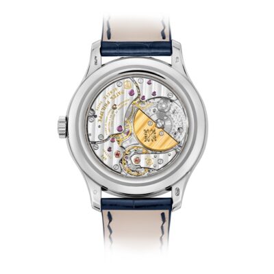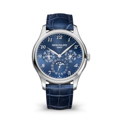 Unworn Patek Philippe Grand Complication Automatic Luxury Men’s watch 39mm with 18kt White Gold case, Reference 5327G-001. This model has Royal blue sunburst dial with 18kt White Gold leaf-style shape hands and 18kt White Gold applied Breguet Arabic numeral hour markers. Minute markers around the outer rim. Chronograph consists of three sub-dials display, which show Month and Day of the Week, Moonphase. Polished 18k White Gold screws down crown with ribbed edge for comfortable grip and logo Patek Philippe. The dial closed by a Scratch-resistant Sapphire Crystal and Interchangeable full case back of sapphire-crystal. The watch is equipped fixed polished 18kt White Gold bezel. The watch is mechanical self-winding Manufacture Patek Philippe Calibre 240 Q Automatic movement, containing 27 Jewels, composed of 275 parts, bitting at 21600 vph, and has a power reserve of approximately 48 hours. This model presented on Alligator Leather Strap with square scales, hand-stitched, shiny navy blue with an 18kt White Gold fold-over clasp. The water resistance is up to 30m/100ft (3 ATM).