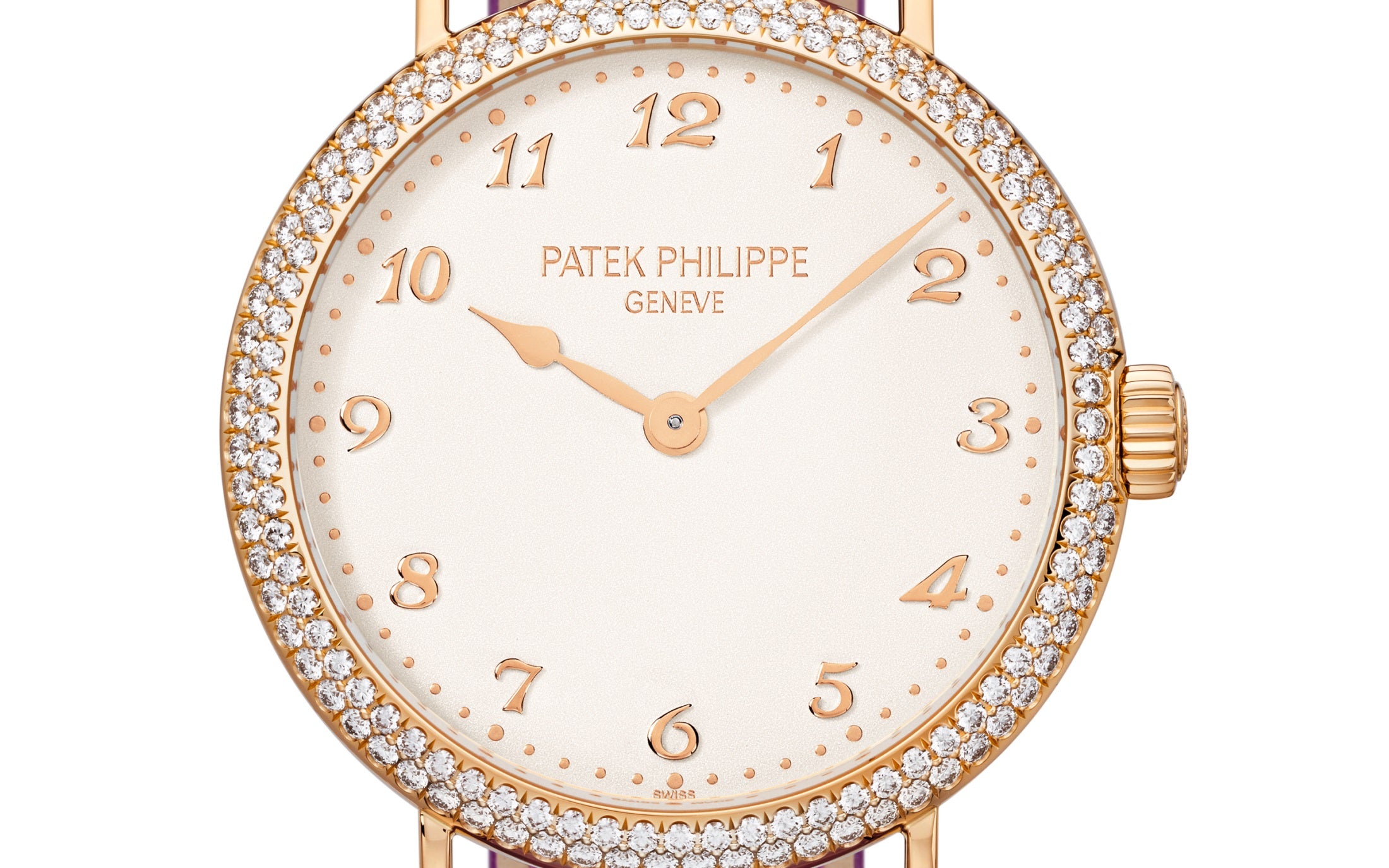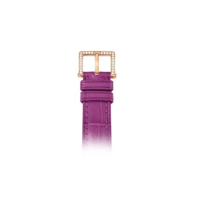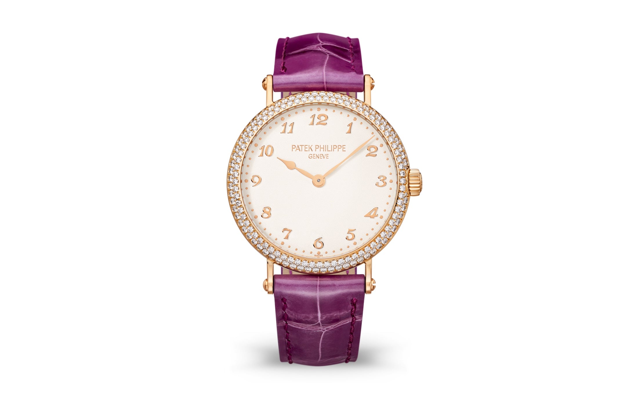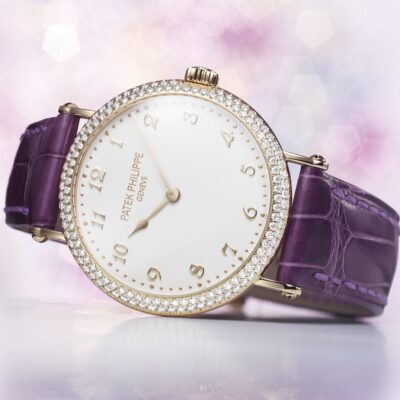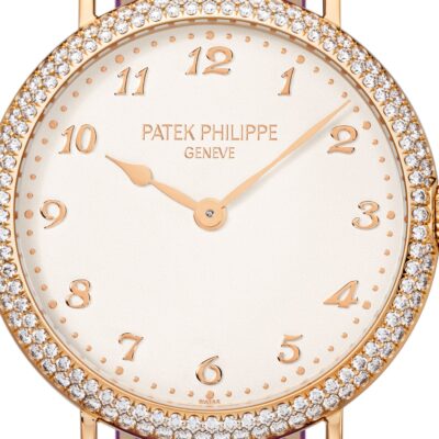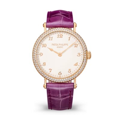 Luxury Patek Philippe Ladies’ Calatrava Polished 18k Rose Gold, 34,6mm and Reference 7200/200R-001. This model has gentle Silvery grained dial. On him looks spectacular Breguet-style overhead Arabic numerals, elegantly shaped polished 18k Rose Gold hands and 18k Rose gold dot minute track. A polished 18k Rose Gold Pull/push crown with a ribbed edge for easy grip and the Patek Philippe logo is located on the right side of the case. The dial closed by a Scratch-resistant Sapphire Crystal and sapphire-crystal case back which allows of the case, allows you to see the magical work of the movement. The watch features a luxurious 18K rose gold fixed polished bezel, set with 142 brilliant-cut diamonds set in two rows, totaling 1.08 carats. This model has received the best ultra-thin caliber Patek Philippe Caliber 240, a self-winding mechanical movement containing 27 precious stones, with a power reserve of 48 hours. She is presented is on shiny royal purple Alligator/Crocodile leather strap with square scales, hand-stitched and an 18k Rose Gold Prong buckle set with 26 diamonds (~0.18 ct). The water resistance is up to 30m/100ft (3 ATM).