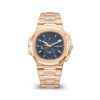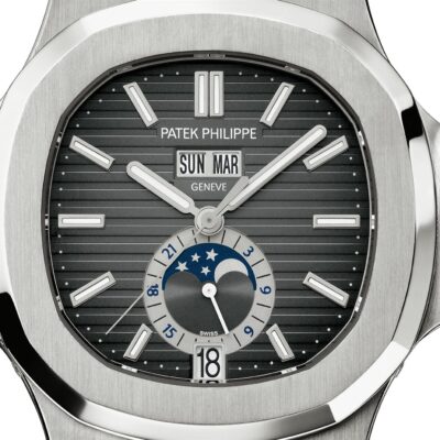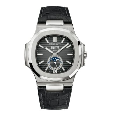 The new luxury watch Patek Philippe Nautilus Annual Calendar, Moon Phases, Stainless Steel, 40,5mm, reference 5726A-001, is the perfect combination of traditional elegance and sporty style with a timeless design. The unmistakable design of the case and bezel is accentuated by a subtle alternation of satin and polished hand-finished finishes. To achieve perfect readability (a Patek Philippe requirement for all its watches), the black dial of this model is equipped with large 18K white gold hour and minute hands with a luminescent coating, as well as 18K White Gold applied luminescent indexes. The thin and elegant second hand, also made of 18k White Gold, and the dotted minute track applied on the outer edge of the dial, help to determine the time more precisely. The day of the week and month are displayed in two windows next to the 12 o’clock position. Meanwhile, a date window is integrated into a subdial at 6 o’clock, which in turn displays a 24-hour and moon phase display. A polished Stainless Steel Screw-down crown with a ribbed edge for easy grip and the Patek Philippe logo is completes the watch’s harmony. The dial closed by a Scratch-resistant Sapphire Crystal. Sapphire-crystal too case back, which allows of the case, allows you to see the magical work of the movement. The wide, rounded octagonal Stainless Steel bezel, satin on the front and polished on the sides, provides a wide view of the dial as the horizon is visible through the porthole. What’s more, the side protrusions, also called “lugs”, are inspired by the hinges on these windows. The Model has Patek Philippe Caliber 324 S QA LU 24H/303, with a self-winding mechanical movement containing 34 Jewels, with a power reserve of min. 35 hours – max. 45 hours. This beautiful sport-chic watch presented on the black alligator/crocodile leather strap with a Patek Philippe patented Stainless Steel Nautilus fold-over clasp. The water resistance is up to 120m/394ft (12 ATM).