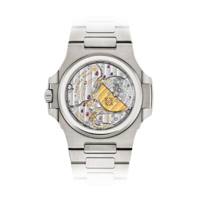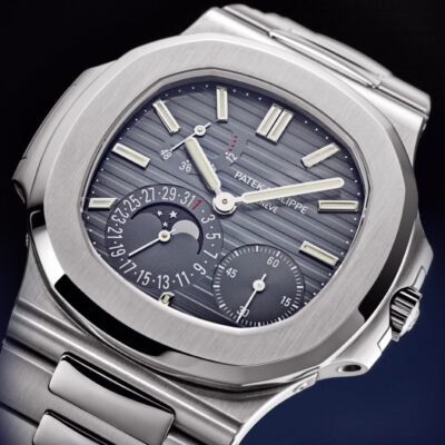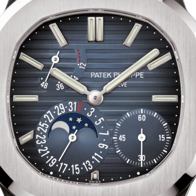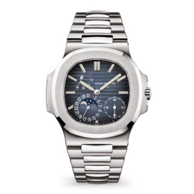 The new luxury watch Patek Philippe Nautilus Date, Moon Phases, Stainless Steel, 40 mm, reference 5712/1A-001, is the perfect combination of traditional elegance and sporty style with a timeless design. The black-blue dial with a horizontal relief, which is one of the hallmarks of this model, looks organic. To achieve perfect readability (Patek Philippe requirement for all their watches), the dial features large silver-tone hour and minute hands with luminescent coating, as well as applied luminous indexes. On the outer edge of the dial, a dotted minute scale is applied, which helps to determine the time more accurately. Between 10 and 11 o’clock, the power reserve indicator is quite appropriately placed. At the 7 o’clock position there is an indicator showing the date and phases of the moon. Moreover, at the 5 o’clock position there is a small second subdial. A polished Stainless Steel Screw-down crown with a ribbed edge for easy grip and the Patek Philippe logo is completes the watch’s harmony. The dial closed by a Scratch-resistant Sapphire Crystal. Sapphire-crystal too case back, which allows of the case, allows you to see the magical work of the movement. The wide, rounded octagonal stainless steel bezel, brushed on the front and polished on the sides, provides a wide view of the dial as the horizon is visible through the porthole. What’s more, the side protrusions, also called “lugs”, are inspired by the hinges on these windows. The Model has Patek Philippe Caliber 240 PS IRM C LU, with a self-winding mechanical movement containing 29 Jewels, with a power reserve of min. 38 hours – max. 48 hours. This beautiful sport-chic watch presented on a Stainless Steel Bracelet, combines elegance with a truly comfortable fit. It features a Patek Philippe patented Stainless Steel Nautilus fold-over clasp. The water resistance is up to 60m/200ft (6 ATM).