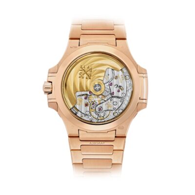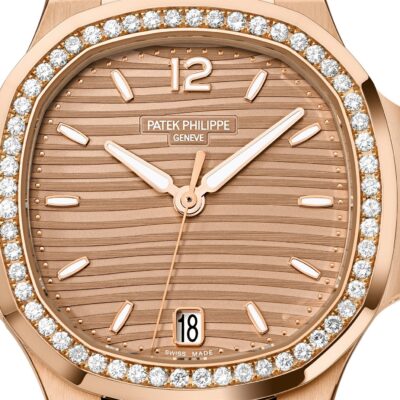 Ladies Watch Patek Philippe Nautilus Ladies Automatic 18k Rose Gold case with polished and satin finishes, 35,2mm, Reference 7118/1200R-010 – has been the standard in luxury, because combine elegance, sporty style and timeless design. Is striking watch boasts a Golden brown Opaline dial with gently undulating embossed decor dial, 18k Rose Gold applied hour markers and Arabic numeral at the 12 o’clock positioning with a luminescent coating for easy readability in dim lighting as well as Dot minute markers around the outer rim. The sweep seconds hand and date in an aperture features at the 6 o’clock positioning give this model a clean profile and make keeping track of both date and time convenient. Complementing the elegant dial are 18k Rose Gold polished luminous alpha-style shape hands. A polished 18k Rose Gold Screw-down crown with a ribbed edge for easy grip and the Patek Philippe logo is completes the watch’s harmony. The dial closed by a Scratch-resistant Sapphire Crystal. Sapphire-crystal too case back, which allows of the case, allows you to see the magical work of the movement. The wide rounded octagonal with polished and satin finishes bezel, in an 18k Rose Gold, provides a wide view of the dial, as the horizon is visible through the porthole. Moreover, side protrusions, also called “lugs”, are inspired by the hinges on these windows. In addition, 56 diamonds (~0.67 carats) decorating the bezel make it fantastic. The Model has caliber Patek Philippe Caliber 324 S C, with a self-winding mechanical movement containing 29 Jewels, with a power reserve of min. 35 hours – max. 45 hours. In addition, this beautiful sport-chic watch on presented on the 18k Rose Gold bracelet with polished and satin finishes and 18k Rose Gold Nautilus fold-over clasp. The water resistance is up to 60m/200ft (6 ATM).