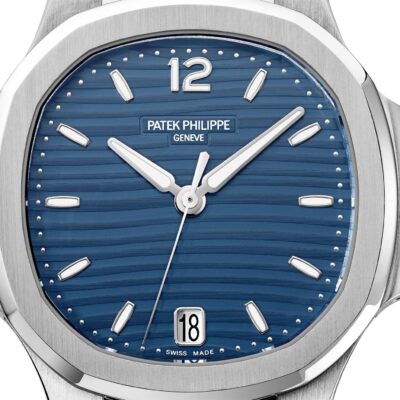 Ladies Watch Patek Philippe Nautilus Stainless Steel case with polished and satin finishes, 35,2mm, Reference 7118/1A-001 – has been the standard in luxury, because combine elegance, sporty style and timeless design. Is striking watch boasts a Blue Opaline with horizontally embossed dial, 18k White Gold applied hour markers and Arabic numeral at the 12 o’clock positioning with a luminescent coating for easy readability in dim lighting as well as Dot minute markers around the outer rim. The sweep seconds hand and date in an aperture features at the 6 o’clock positioning give this model a clean profile and make keeping track of both date and time convenient. Complementing the elegant dial are 18k White Gold polished luminous alpha-style shape hands. A polished Stainless Steel Screw-down crown with a ribbed edge for easy grip and the Patek Philippe logo is completes the watch’s harmony. The dial closed by a Scratch-resistant Sapphire Crystal. Sapphire-crystal too case back, which allows of the case, allows you to see the magical work of the movement. The wide rounded octagonal with polished and satin finishes bezel, in a Stainless Steel, provides a wide view of the dial as the horizon is visible through the porthole. Moreover, the side protrusions, also called “lugs”, are inspired by the hinges on these windows. The Model has caliber Patek Philippe Caliber 324 S C, with a self-winding mechanical movement containing 29 Jewels, with a power reserve of min. 35 hours – max. 45 hours. In addition, this beautiful sport-chic watch on presented on the Stainless Steel bracelet with polished and satin finishes and Stainless Steel Nautilus fold-over clasp. The water resistance is up to 60m/200ft (6 ATM).