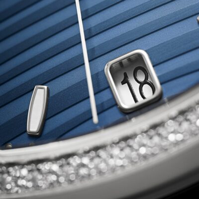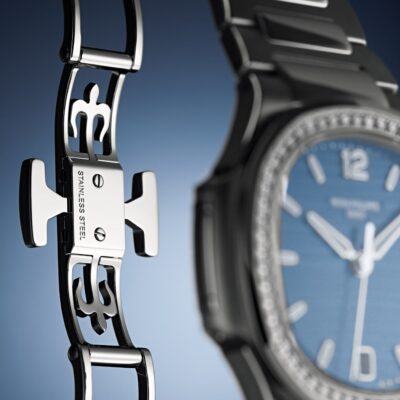 Ladies Watch Patek Philippe Nautilus Ladies Automatic Stainless Steel case with polished and satin finishes, 35,2mm, Reference 7118/1200A-001 – has been the standard in luxury, because combine elegance, sporty style and timeless design. Is striking watch boasts a Blue Opaline dial with gently undulating embossed decor dial, 18k White Gold applied hour markers and Arabic numeral at the 12 o’clock positioning with a luminescent coating for easy readability in dim lighting as well as Dot minute markers around the outer rim. The sweep seconds hand and date in an aperture features at the 6 o’clock positioning give this model a clean profile and make keeping track of both date and time convenient. Complementing the elegant dial are 18k White Gold polished luminous alpha-style shape hands. A polished Stainless Steel Screw-down crown with a ribbed edge for easy grip and the Patek Philippe logo is completes the watch’s harmony. The dial closed by a Scratch-resistant Sapphire Crystal. Sapphire-crystal too case back, which allows of the case, allows you to see the magical work of the movement. The wide rounded octagonal with polished and satin finishes bezel, in a Stainless Steel, provides a wide view of the dial, as the horizon is visible through the porthole. Moreover, side protrusions, also called “lugs”, are inspired by the hinges on these windows. In addition, 56 diamonds (~0.67 carats) decorating the bezel make it fantastic. The Model has caliber Patek Philippe Caliber 324 S C, with a self-winding mechanical movement containing 29 Jewels, with a power reserve of min. 35 hours – max. 45 hours. In addition, this beautiful sport-chic watch on presented on the Stainless Steel bracelet with polished and satin finishes and Stainless Steel Nautilus fold-over clasp. The water resistance is up to 60m/200ft (6 ATM).