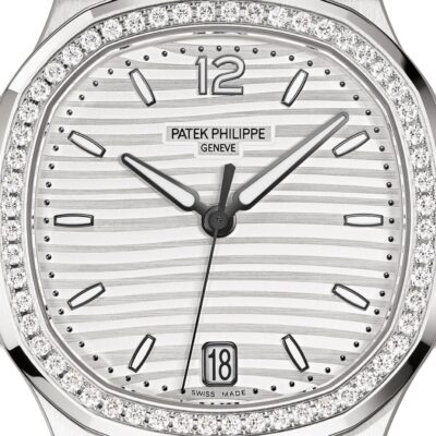 Ladies Watch Patek Philippe Nautilus Ladies Automatic Stainless Steel case with polished and satin finishes, 35,2mm, Reference 71181/200A-010 – has been the standard in luxury, because combine elegance, sporty style and timeless design. Is striking watch boasts a Silvery Opaline dial with gently undulating embossed decor dial, 18k White Gold applied hour markers and Arabic numeral at the 12 o’clock positioning with a luminescent coating for easy readability in dim lighting as well as Dot minute markers around the outer rim. The sweep seconds hand and date in an aperture features at the 6 o’clock positioning give this model a clean profile and make keeping track of both date and time convenient. Complementing the elegant dial are 18k White Gold polished luminous alpha-style shape hands. A polished Stainless Steel Screw-down crown with a ribbed edge for easy grip and the Patek Philippe logo is completes the watch’s harmony. The dial closed by a Scratch-resistant Sapphire Crystal. Sapphire-crystal too case back, which allows of the case, allows you to see the magical work of the movement. The wide rounded octagonal with polished and satin finishes bezel, in a Stainless Steel, provides a wide view of the dial, as the horizon is visible through the porthole. Moreover, side protrusions, also called “lugs”, are inspired by the hinges on these windows. In addition, 56 diamonds (~0.67 carats) decorating the bezel make it fantastic. The Model has caliber Patek Philippe Caliber 324 S C, with a self-winding mechanical movement containing 29 Jewels, with a power reserve of min. 35 hours – max. 45 hours. In addition, this beautiful sport-chic watch on presented on the Stainless Steel bracelet with polished and satin finishes and Stainless Steel Nautilus fold-over clasp. The water resistance is up to 60m/200ft (6 ATM).