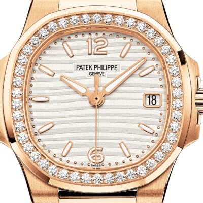 Ladies Watch Patek Philippe Nautilus Quartz Diamond 18k Rose Gold case, 32mm, Reference 7010/1R-011- has been the standard in luxury, because combine elegance, sporty style and timeless design. Is striking watch boasts a Silvery Opaline with horizontally embossed dial, 18k Rose Gold applied hour markers and Arabic numerals at the 6 and 12 o’clock positioning a luminescent coating for easy readability in dim lighting as well as Dot minute markers around the outer rim. The sweep seconds hand and date in an aperture features at the 3 o’clock positioning give this model a clean profile and make keeping track of both date and time convenient. Complementing the elegant dial are polished 18k Rose Gold luminous hands. A polished 18k Rose Gold crown with a ribbed edge for easy grip and the Patek Philippe logo is completes the watch’s harmony. The dial closed by a Scratch-resistant Sapphire Crystal. The watch features a solid 18K Rose Gold matte case back. The wide hexagonal bezel, bevel features 46 (~0.73 carats) individually cut diamonds, which are inlaid in a blushing 18k Rose Gold base, provides a wide view of the dial as the horizon is visible through the porthole. Moreover, the side protrusions, also called “lugs”, are inspired by the hinges on these windows. Model has caliber Patek Philippe Caliber E 23‑250 S C, a Quartz movement powered by a silver oxide battery with a 3-year lifespan. In addition, an 18k Rose Gold bracelet with 18r Rose Gold Nautilus fold-over clasp is fitted to this beautiful sport-chic watch. The water resistance is up to 60m/200ft (6 ATM).