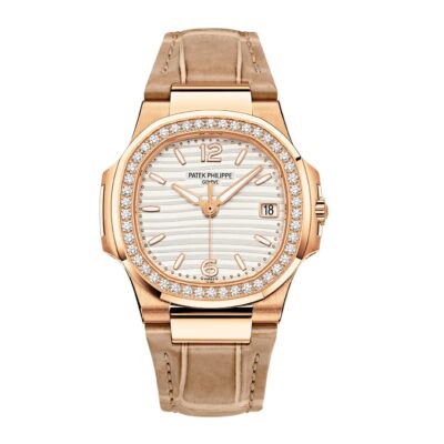 Ladies Watch Patek Philippe Nautilus Quartz Diamond 18k Rose Gold case, 32mm, Reference 7010R-011- has been the standard in luxury , because combine elegance, sporty style and timeless design. Is striking watch boasts a Silver dial with 18k Rose Gold applied hour markers and Arabic numerals at the 6 and 12 o’clock positioning a luminescent coating for easy readability in dim lighting with Dot minute markers around the outer rim. The sweep seconds hand and date in an aperture features at the 3 o’clock positioning give this model a clean profile and make keeping track of both date and time convenient. Complementing the elegant dial are polished 18r Rose Gold luminous hands. A polished 18k Rose Gold crown with a ribbed edge for easy grip and the Patek Philippe logo is completes the watch’s harmony. The dial closed by a Scratch-resistant Sapphire Crystal. The watch features a solid 18K Rose Gold matte case back. The wide hexagonal bezel, bevel features 46 (~0.73 carats) individually cut diamonds, which are inlaid in a blushing 18k Rose Gold base, provides a wide view of the dial as the horizon is visible through the porthole. Moreover, the side protrusions, also called “lugs”, are inspired by the hinges on these windows. Model has caliber Patek Philippe Caliber E 23‑250 S C, a Quartz movement powered by a silver oxide battery with a 3-year lifespan. In addition, a shiny beige Alligator/Crocodile leather strap with square scales with 18r Rose Gold Nautilus fold-over clasp is fitted to this beautiful sport-chic watch. The water resistance is up to 60m/200ft (6 ATM).