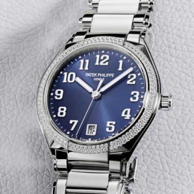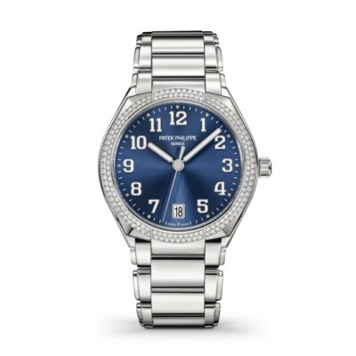 New Patek Philippe Twenty~4 Automatic luxury watch, 36mm, Stainless Steel with 160 diamonds ~0,77ct, Ref. 7300/1200A-001. Reliable and modern, feminine and elegant meticulously crafted is truly a sight to behold and a joy to wear. Despite its sophistication, this watch is presented as a casual chic that can be worn every day – a kind of all-rounder. Their case is 10.05mm thick, yet it remains comfortable and has a modern look on the wrist. The elegant blue dial with sunburst finish is eye-catching. It features sporty pilot-style 18k White Gold Arabic numerals with luminescent coating. The time indicated by large polished luminous nautilus-like (rounded batons) hour and minute 18k White Gold hands, ensuring perfect legibility even in the dark. These are complemented by a slim and elegant 18k White Gold second hand (Sweep seconds hand). As a classic time and date watch, this model has a date window at 6 o’clock. Thin white minute markers with squares every 5 minutes run along the outer edge of the dial. A polished Stainless Steel crown with a ribbed edge for a comfortable grip and the Patek Philippe logo is the finishing touch to the perfect picture. The dial is covered with a scratch-resistant sapphire crystal. A Sapphire Crystal case back, also made allows you to see the magical workings of the movement. The elegant highlight of model is the fixed sparkling Stainless Steel bezel set with 160 diamonds (~0,77ct) flawless. In addition, it is much more complex than just two rows of diamonds surrounding the dial. The bezel follows the curvature of the case and is raised at 12 and 6 o’clock, creating continuity with the bracelet. The model is equipped with a Patek Philippe Caliber 324 S C, with a self-winding mechanical movement containing 29 Jewels, with a power reserve of min. 35 hours – max. 45 hours. This beautiful watch is presented on a seamlessly integrated into the case of the bracelet, and the steps of the links follow the steps of the lugs, giving the watch a more barrel-shaped silhouette. The same applies to the module between the lugs, which follows the shape of the center link. The bracelet are fastens with Patek Philippe’s patented polished Stainless Steel folding clasp and engraved with the Calatrava cross. Opening the clasp reveals the engraved Patek Philippe logo with the word GENEVE. Water resistant up to 30m/99ft (3 ATM).
