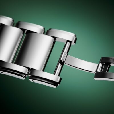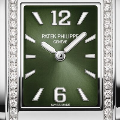 New Patek Philippe Twenty~4 Quartz Diamond Ladies luxury watch, 25.1 x 30 mm, Stainless Steel with 36 diamonds (~0.42 ct), Ref. 4910/1200A-011. This prestigious wristwatch is the epitome of timeless feminine elegance. The combination of classic and modern has made this watch the perfect companion for active professional women who want to stand out and express themselves. The sophisticated design of this stunning watch complements both business dresses and evening attire. The main attraction of the model is an Olive green dial with sunbeams decorated. Its beauty is emphasized large by 18k White Gold trapezoid-shaped markers and well-read even in the dark 18k White Gold Arabic numerals 6 and 12 with luminescent coating. Hands in the form of wands made of 18k White Gold with a luminescent coating also look luxurious. The polished Stainless Steel crown, the Patek Philippe logo the Calatrava Cross trademark, completes the perfect image. The dial is covered with a slightly curved scratch-resistant sapphire crystal, which emphasizes the curves of the case. The solid case back is made of Stainless Steel. The elegant highlight of the model is a slightly curved case with stunning flawless Wesselton diamonds arranged vertically along the case on a fixed Stainless Steel bezel, 18 on each side. The model is equipped with a Patek Philippe Quartz movement Caliber E 15 with silver oxide battery 1.55 V and a service life of 3 years. This fabulously beautiful timepiece is presented on a solid Stainless Steel bracelet with wide, gently curved central links framed by narrow double-tiered links. The link steps follow the steps of the lugs, giving the watch a more barrel-shaped silhouette. The same applies to the module between the lugs, which follows the shape of the central link. It fastens with a Patek Philippe patented folding clasp in polished Stainless Steel engraved and the Calatrava cross. Water resistant up to 30m/99ft (3 ATM).