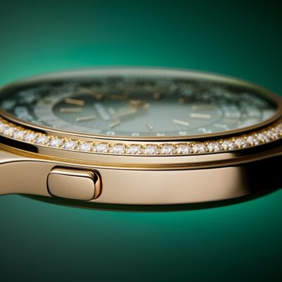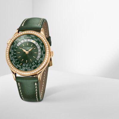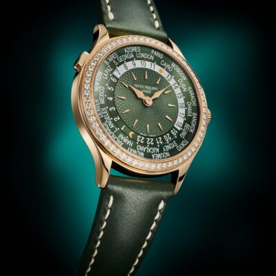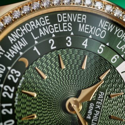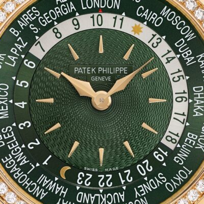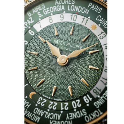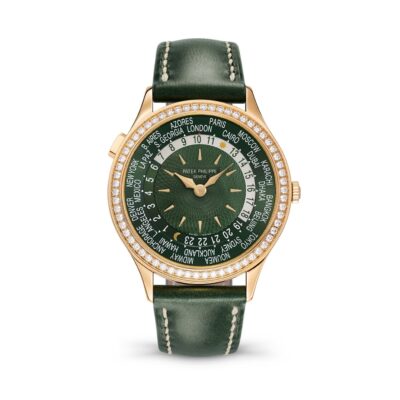 Luxury Patek Philippe Women’s Complication World-Time, 18k Rose Gold, 36mm and Reference 7130R-014. The masters achieve a rethinking of the World Time classic by decorating this model with an original, modern and elegant olive green color. In addition, its central part is a tribute to the rare art of masters who managed to manually create a guilloche pattern in the form of a “Panier” wicker basket. Look good on dial applied 18k Rose Gold index hour markers. Moving outward one-step, we find a 24-hour disk divided into day and night zones, distinguished by their color and symbols of the Sun and Moon. The City Disc, showing all 24 time zones at any given time with their respective cities, is also olive green, but the city names are very legible and printed in large white type. To change the time zone, simply press the button at 10 o’clock and all readings will be adjusted at the same time. Strict Dauphine-inspired central hour and minute hands in 18k Rose Gold add a special touch to the watch. A polished 18k rose gold screw-down crown with a ribbed edge for easy grip and the Patek Philippe logo is located on the right side of the case. The dial closed by a Scratch-resistant Sapphire Crystal and sapphire-crystal case back which allows of the case, allows you to see the magical work of the movement. The watch is equipped Luxury fixed polished 18k Rose Gold bezel set with 62 diamonds (~0.82 ct.). The watch Patek Philippe Caliber 240 HU Self-winding mechanical movement, containing 33 Jewels, and has a power reserve of min. 48 hours. This model presented on shiny olive green Calfskin leather hand-stitched strap. It zips up 18k Rose Gold Prong buckle set with 27 diamonds (~0.21 ct.). The water resistance is up to 30m/100ft (3 ATM).