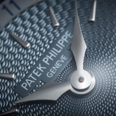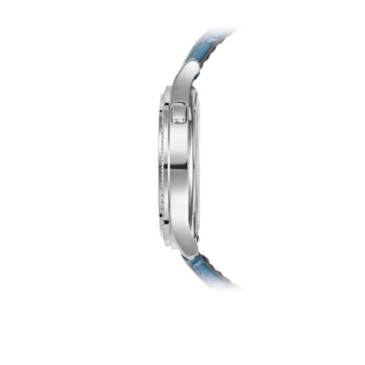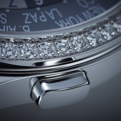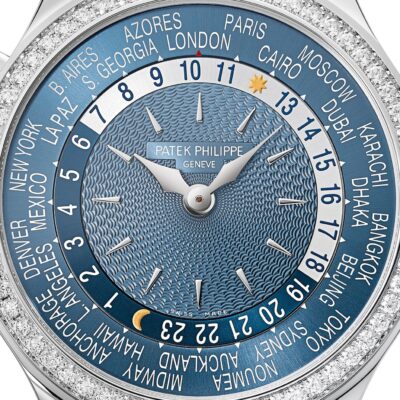 Luxury Patek Philippe Women’s Complication World-Time, 18k White Gold, 36mm and Reference 7130G-016. The masters achieve a rethinking of the World Time classic by decorating this model with an original, modern and elegant Gray-blue color. In addition, its central part is a tribute to the rare art of masters who managed to manually create a guilloche pattern in the form of a “Panier” wicker basket. Look good on dial applied 18k White Gold index hour markers. Moving outward one-step, we find a 24-hour disk divided into day and night zones, distinguished by their color and symbols of the Sun and Moon. The City Disc, showing all 24 time zones at any given time with their respective cities, is also Gray-blue, but the city names are very legible and printed in large white type. To change the time zone, simply press the button at 10 o’clock and all readings will be adjusted at the same time. Strict Dauphine-inspired central hour and minute hands in 18k White Gold add a special touch to the watch. A polished 18k White Gold screw-down crown with a ribbed edge for easy grip and the Patek Philippe logo is located on the right side of the case. The dial closed by a Scratch-resistant Sapphire Crystal and sapphire-crystal case back which allows of the case, allows you to see the magical work of the movement. The watch is equipped Luxury fixed polished 18k White Gold bezel set with 62 diamonds (~0.82 ct.). The watch Patek Philippe Caliber 240 HU Self-winding mechanical movement, containing 33 Jewels, and has a power reserve of min. 48 hours. This model presented on shiny peacock blue Alligator leather with square scales, hand-stitched strap. It zips up 18k White Gold Prong buckle set with 27 diamonds (~0.21 ct.). The water resistance is up to 30m/100ft (3 ATM).