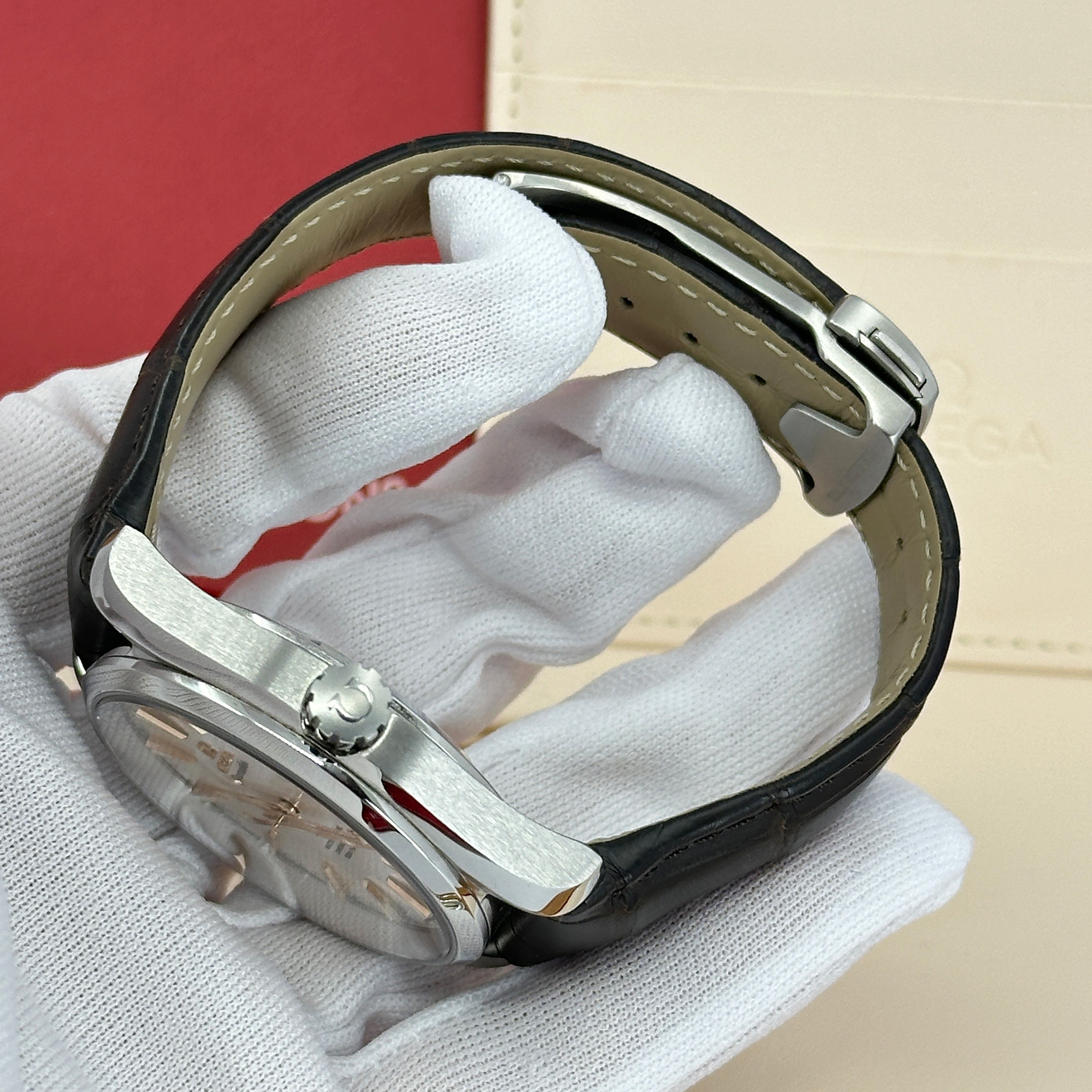 The Omega 231.13.42.21.02.003 Seamaster Aqua Terra 150m Co-Axial is a testament to OMEGA’s maritime legacy. This pre-owned, 2019 model is in mint condition and comes complete with original packaging and manual. The watch features a striking lacquered silvery dial with a Teak Concept pattern and a date window at 3 o’clock, protected by scratch-resistant sapphire crystal. The 41.5mm stainless steel case, paired with a brown leather strap, houses the OMEGA Master Co-Axial calibre 8500, visible through the transparent caseback. This certified chronometer is anti-magnetic, water-resistant to 150m, and comes with a 1-year seller warranty.