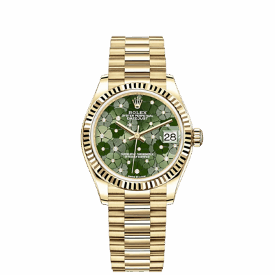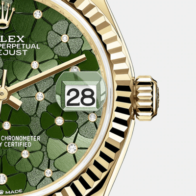 - Dial color: Olive green dial with floral motif and 24 Diamonds in 18k Yellow Gold settings