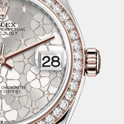 - Dial color: Silver dial with floral motif and 24 diamonds framed in 18k Everose Gold